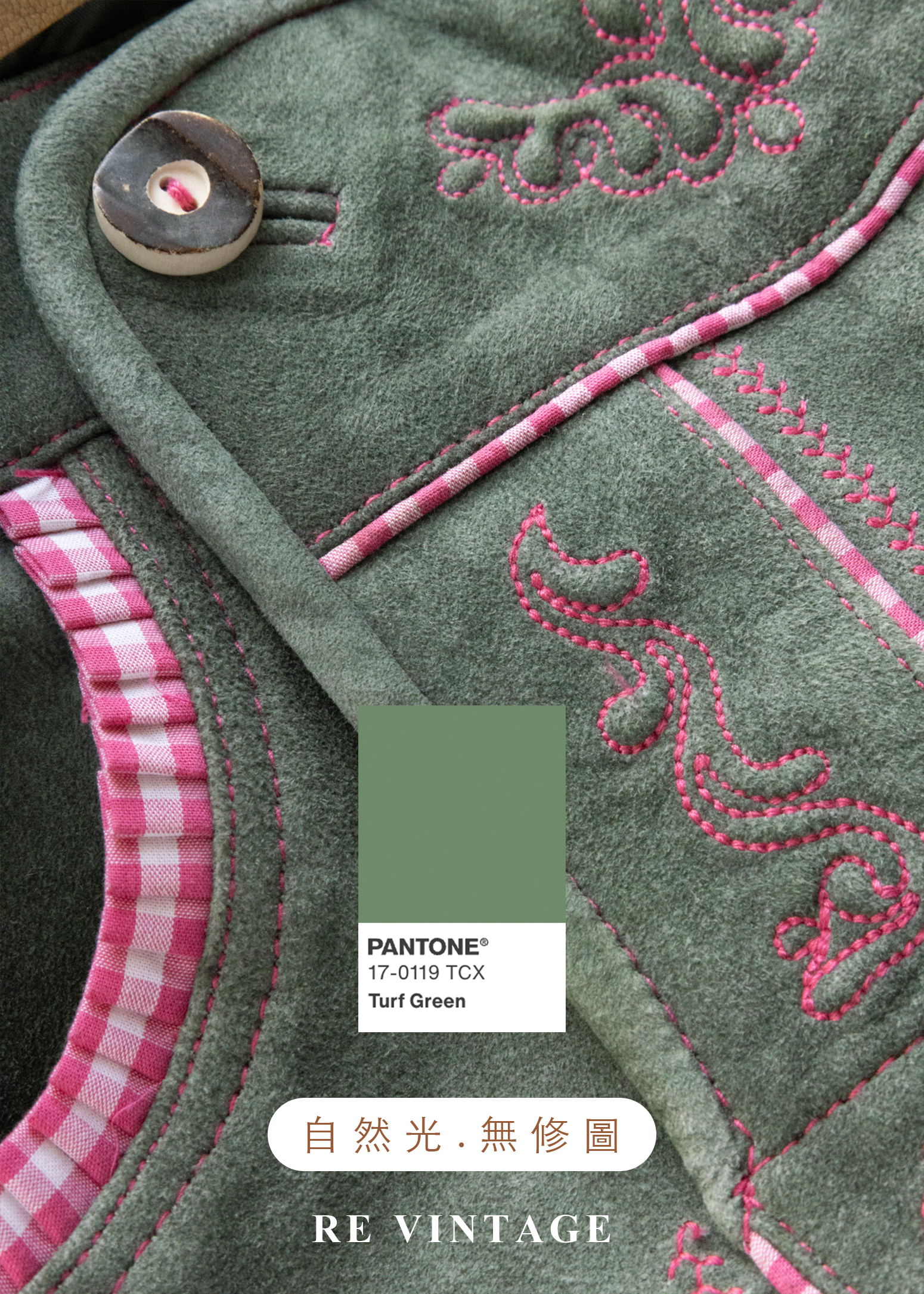 實品的顏色偏軍綠色,請參考細節照上的Pantone色卡