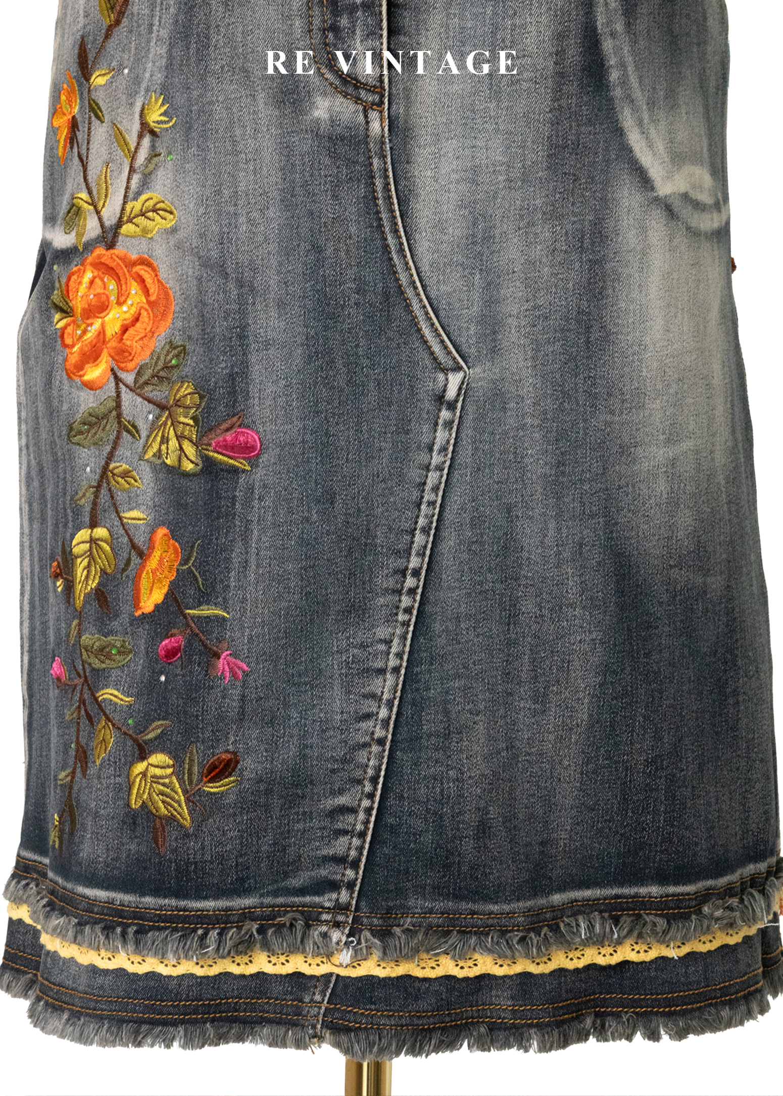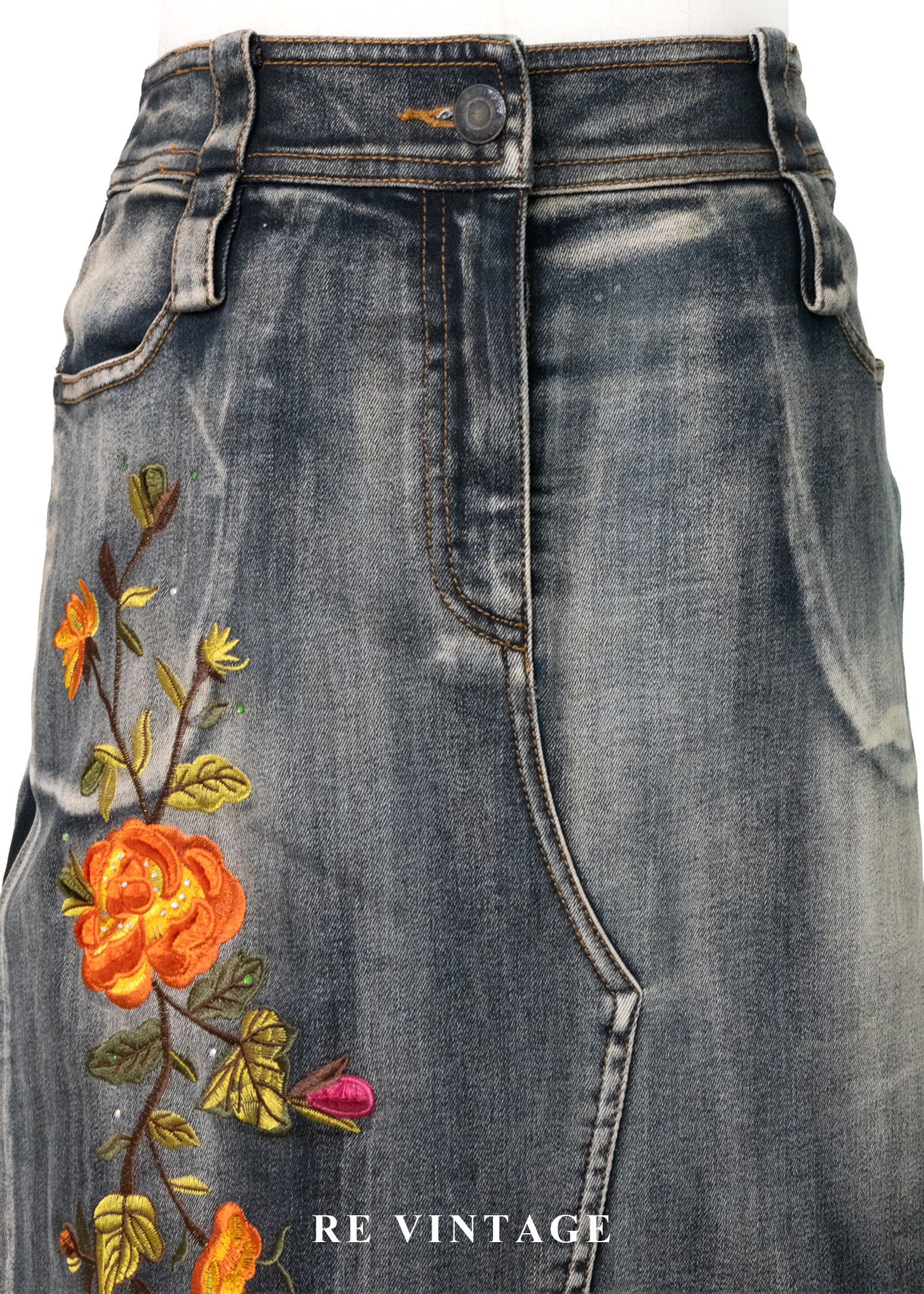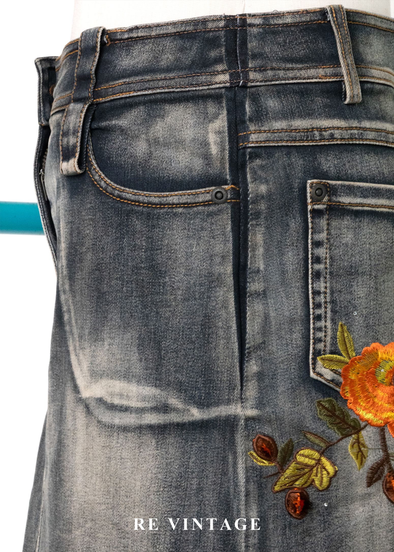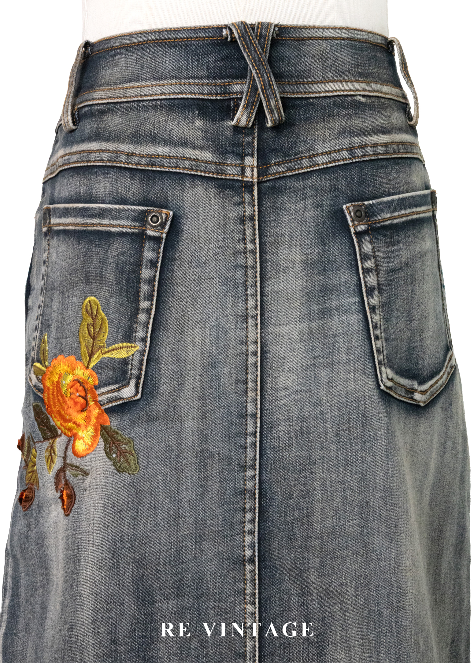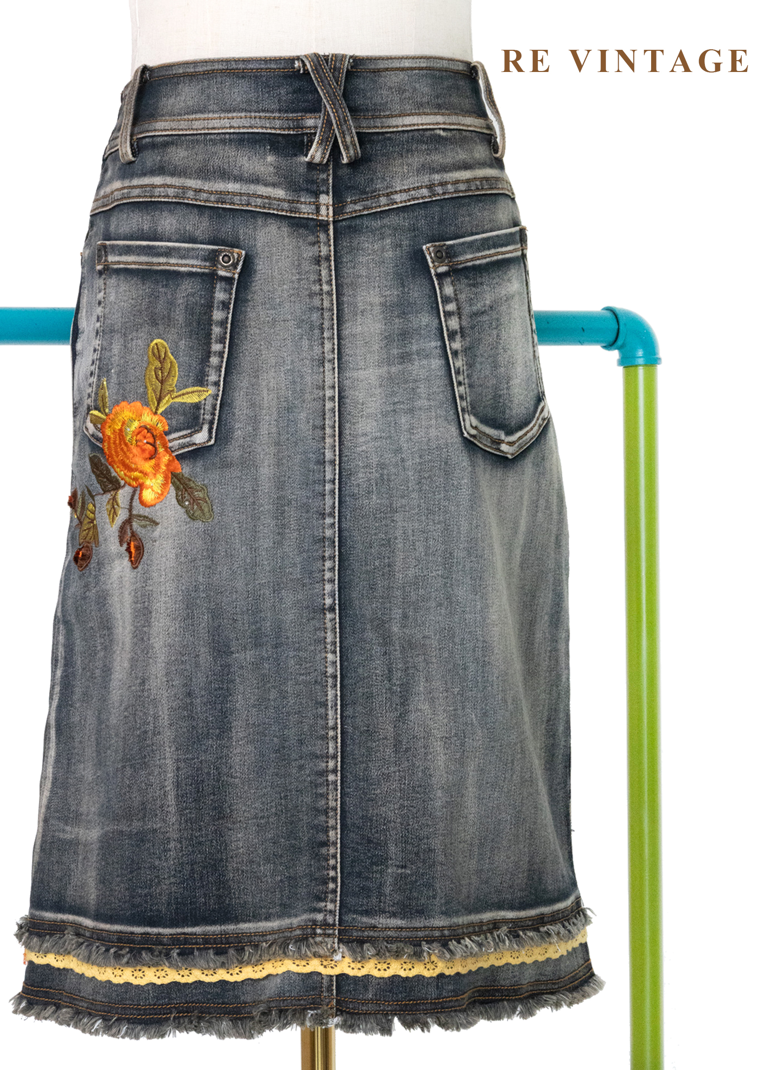 南法花跡 - 暖橘刺繡刷色丹寧裙(26")