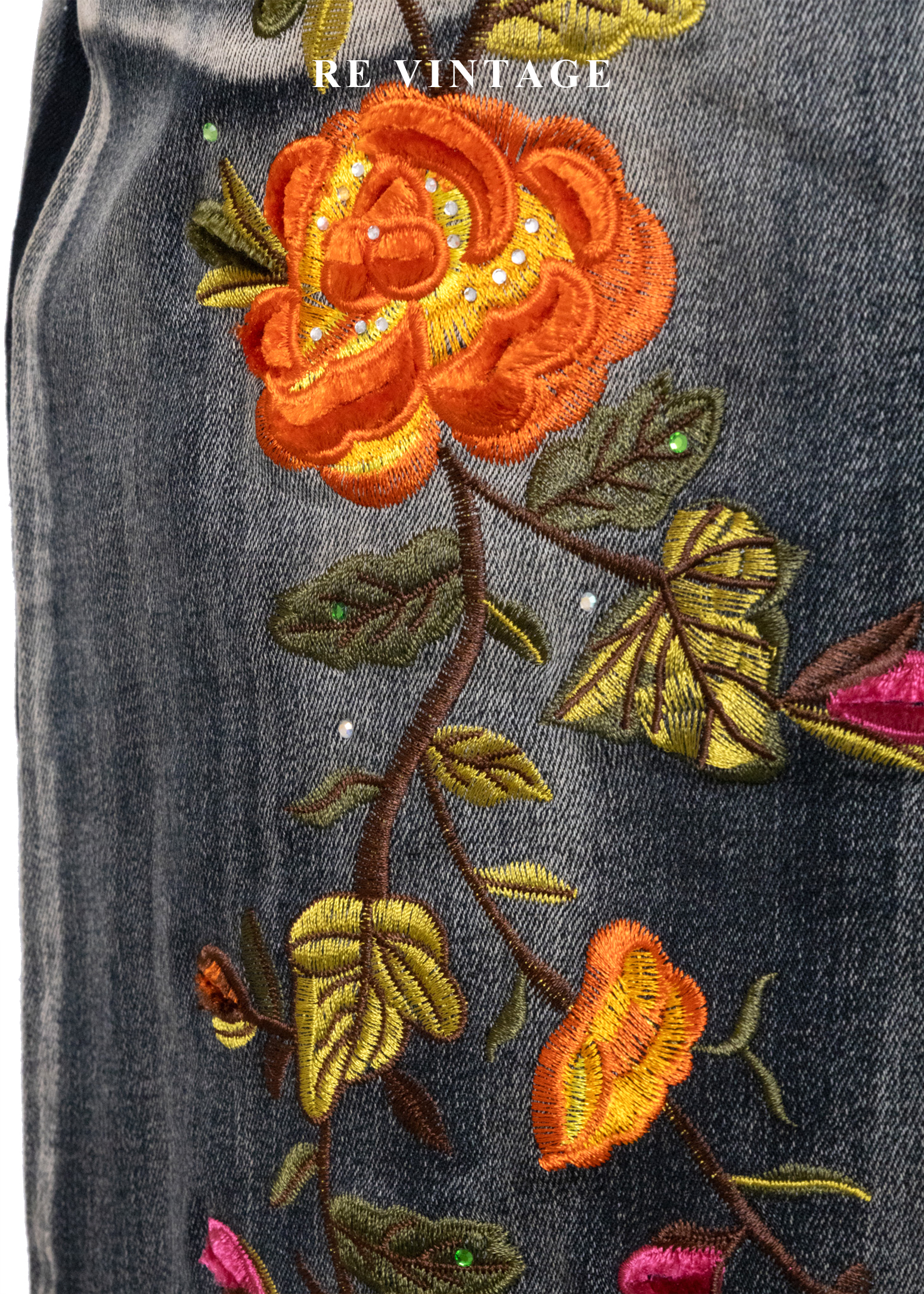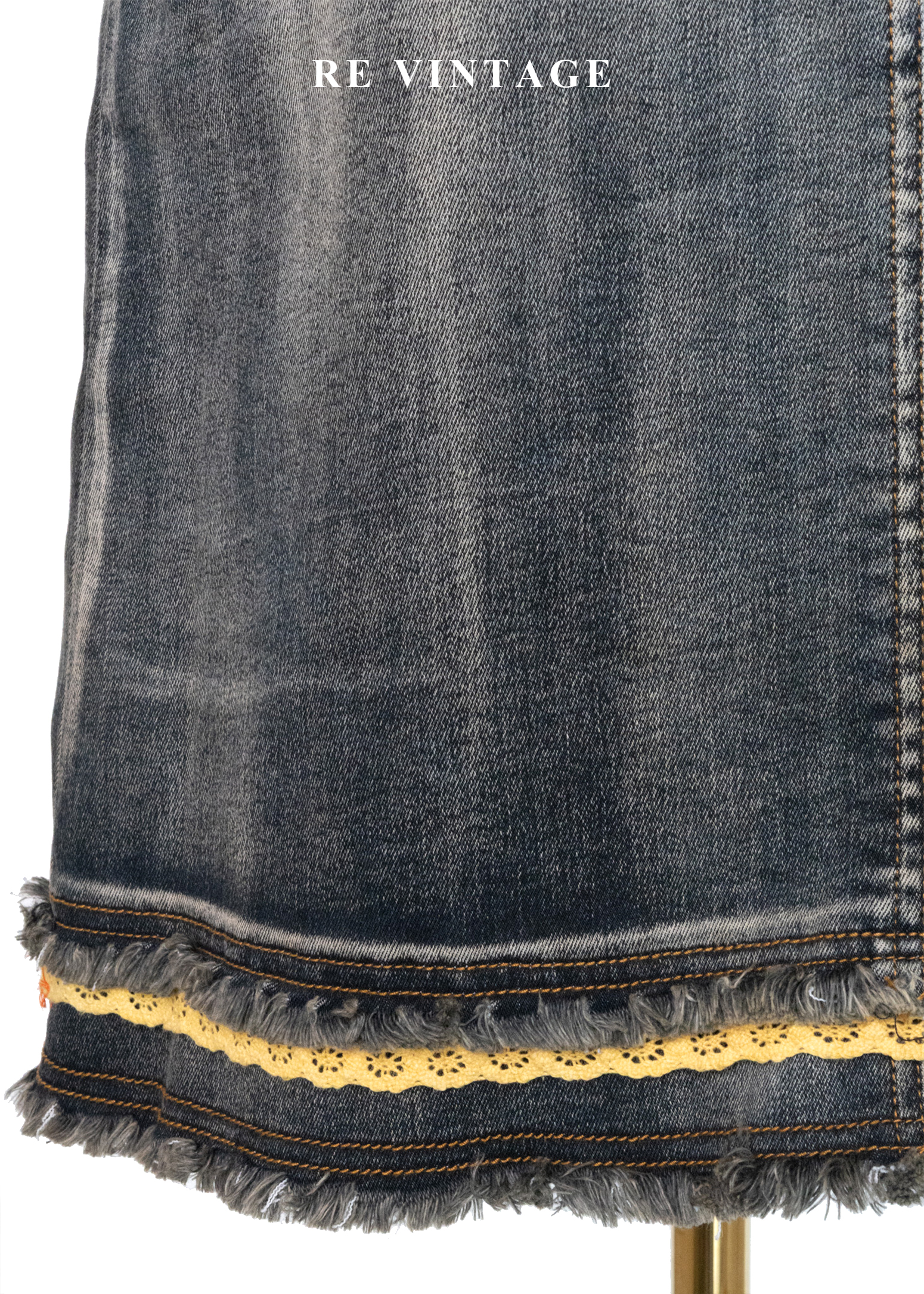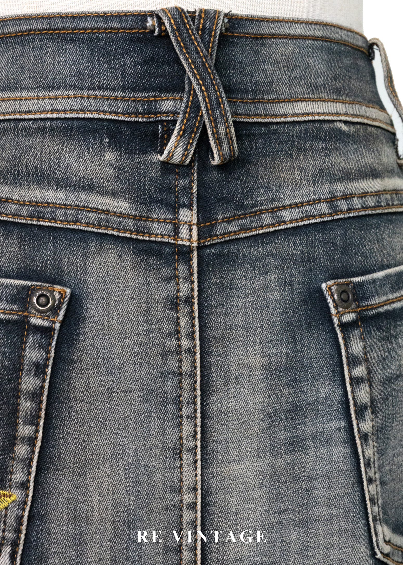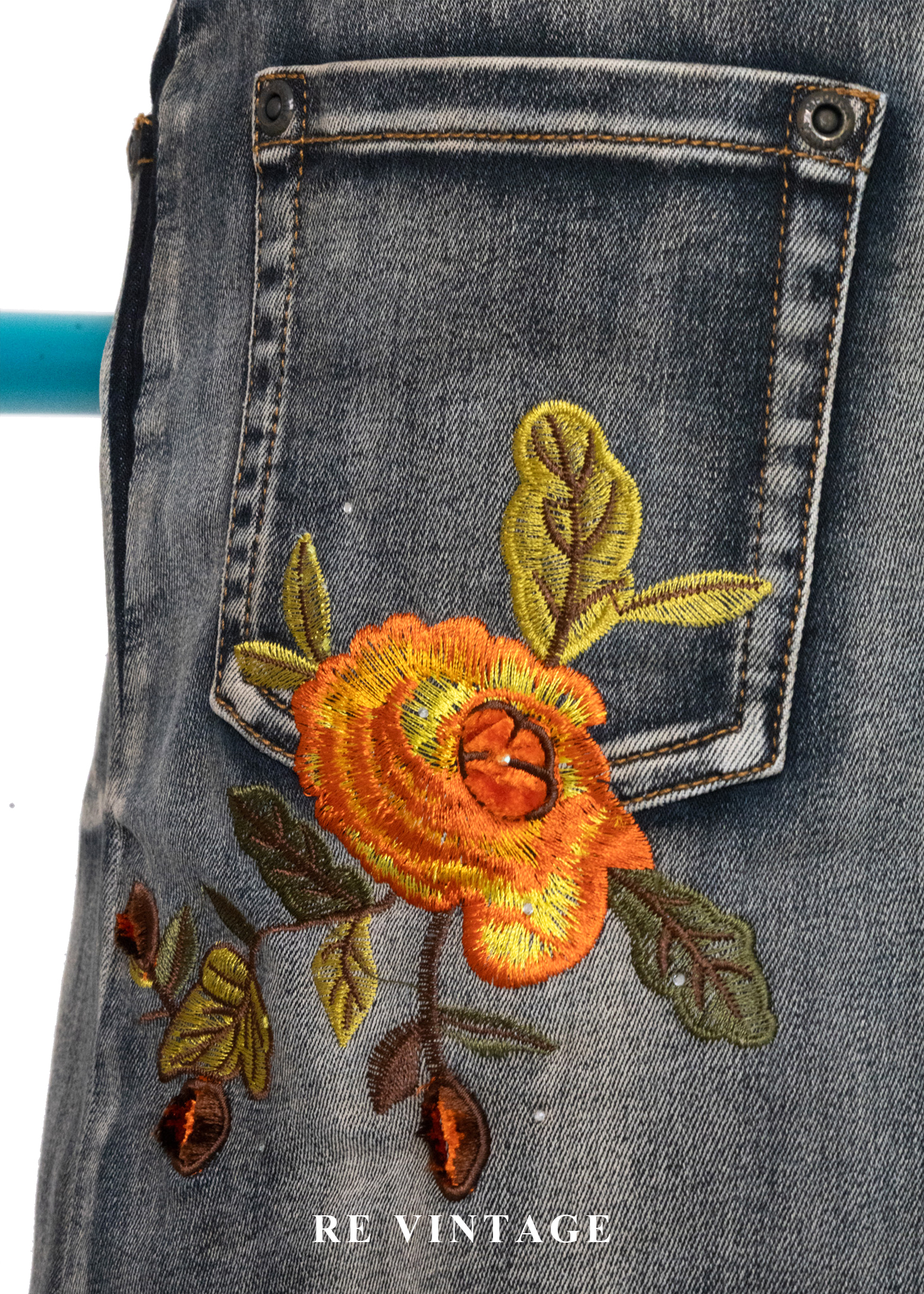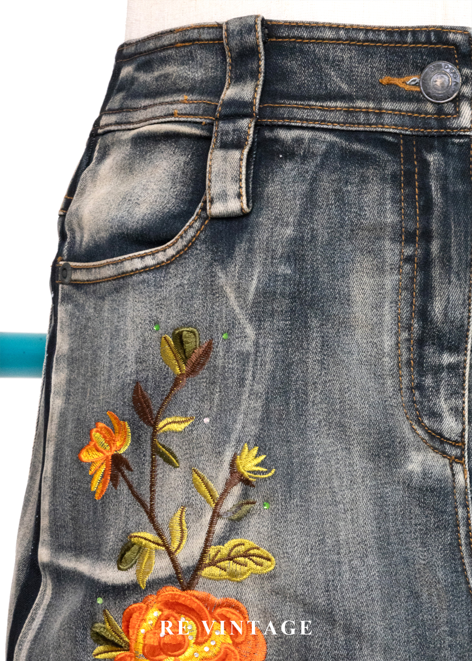 南法花跡 - 暖橘刺繡刷色丹寧裙(26")