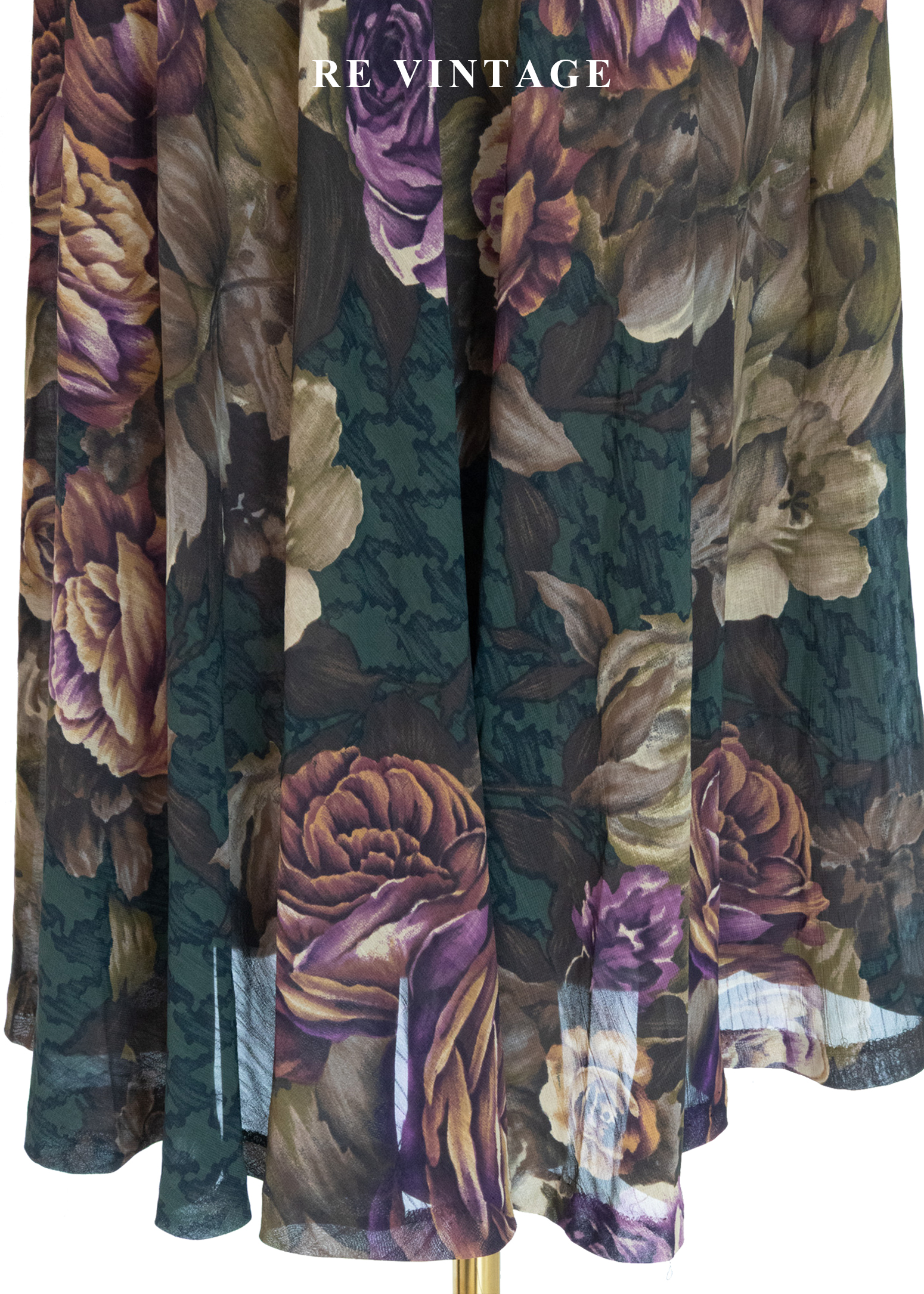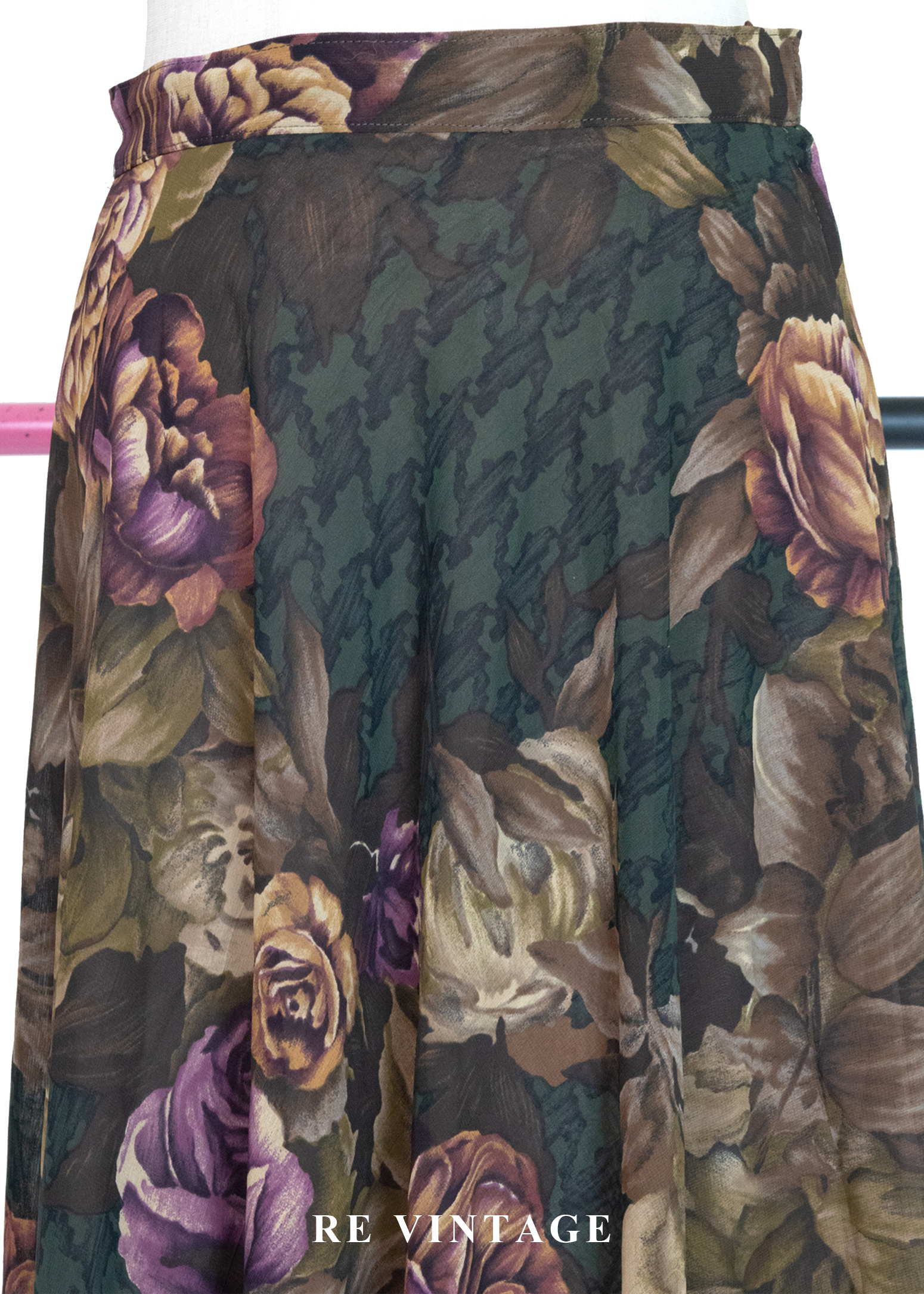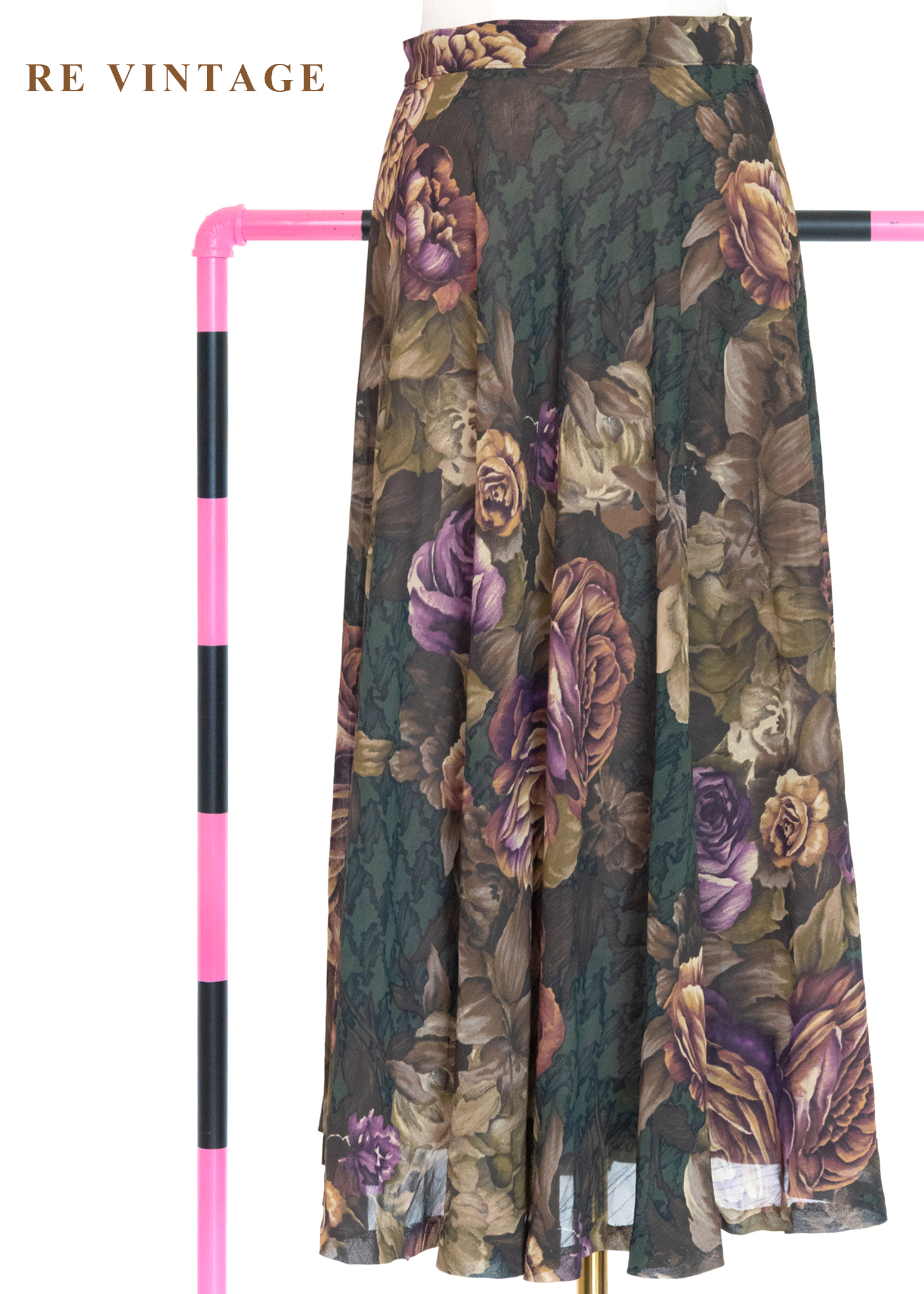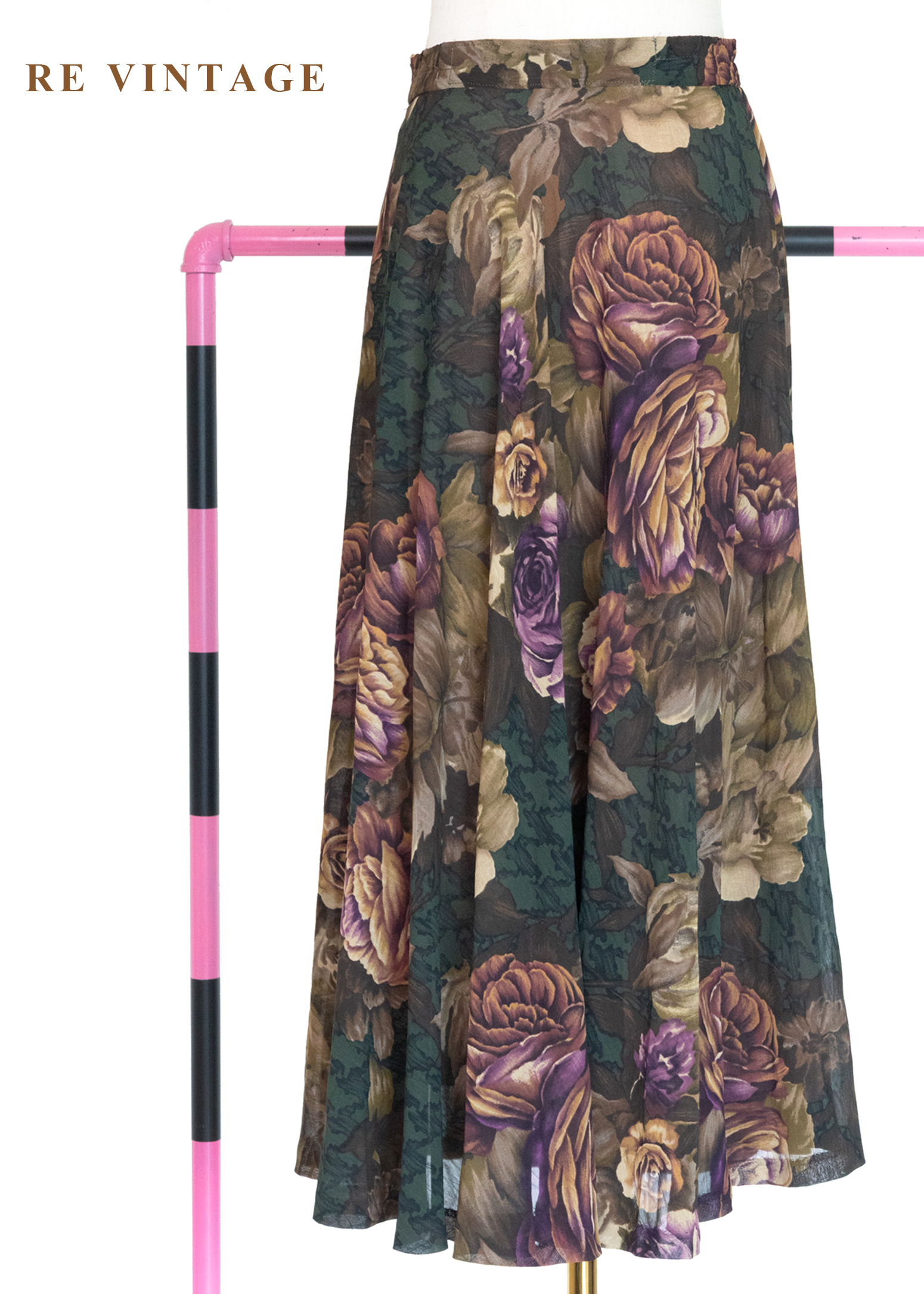 古典大花卉深苔綠千鳥格中長裙(~26")