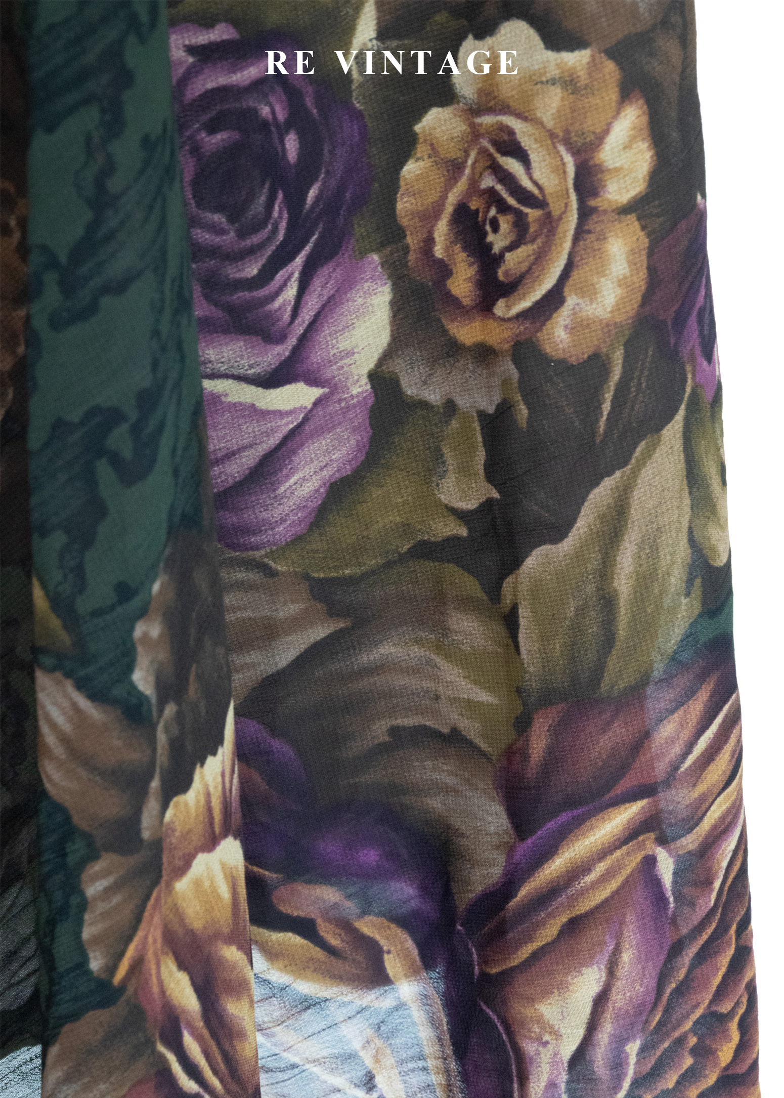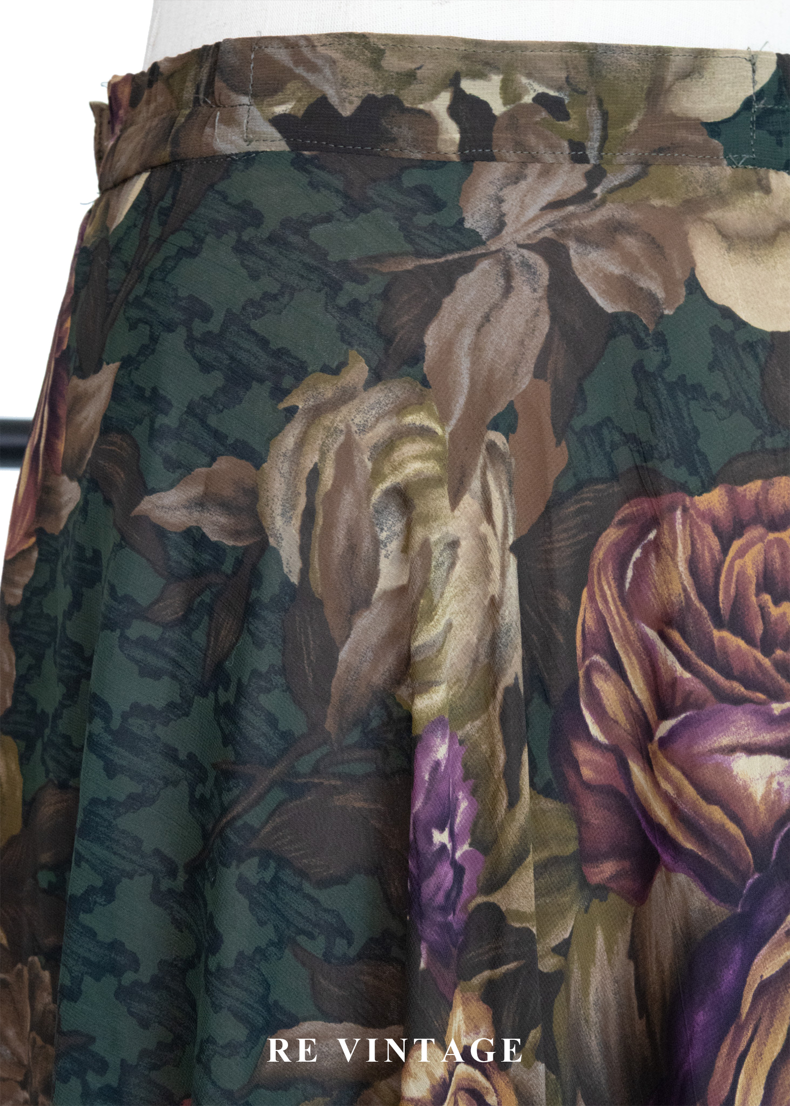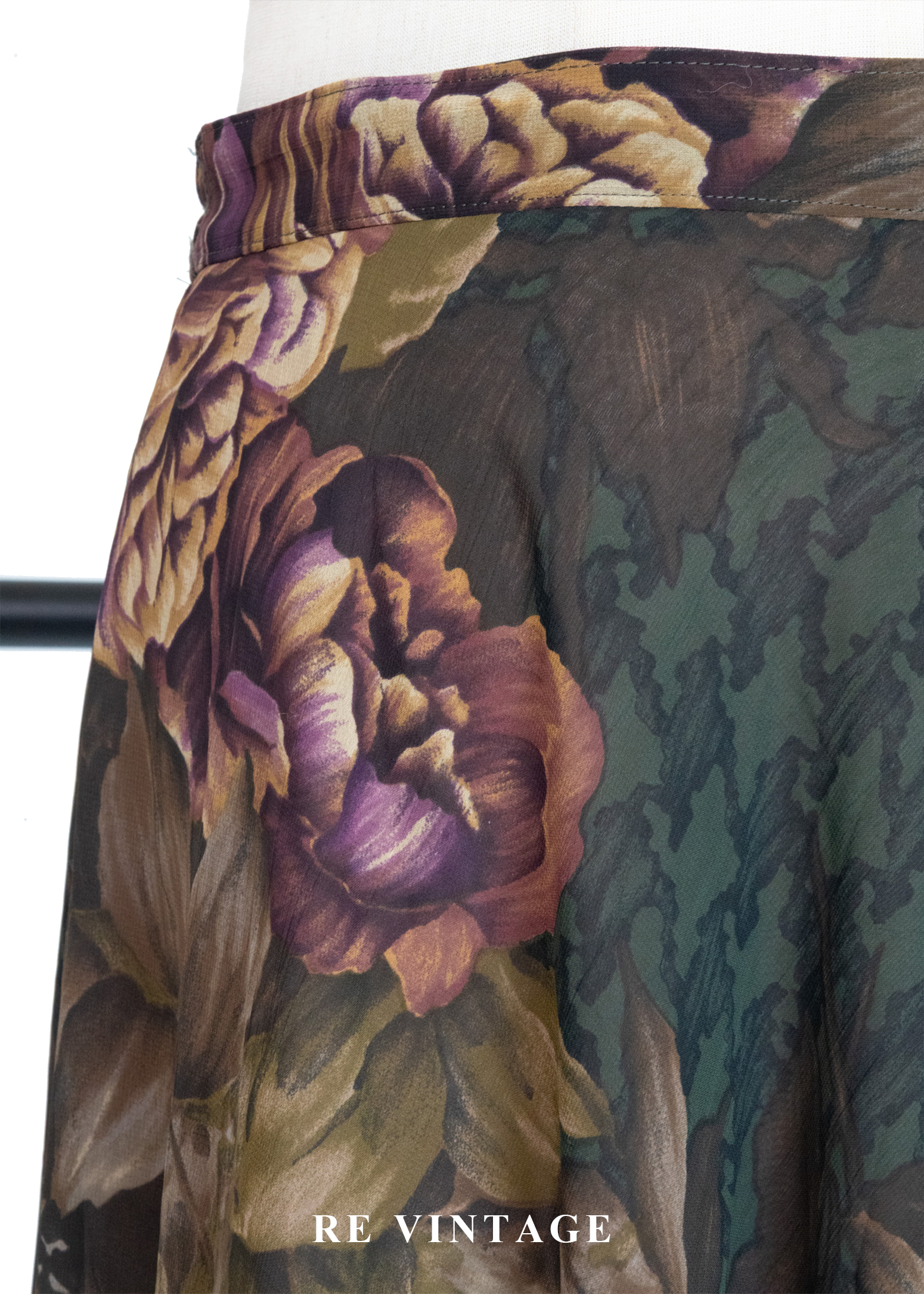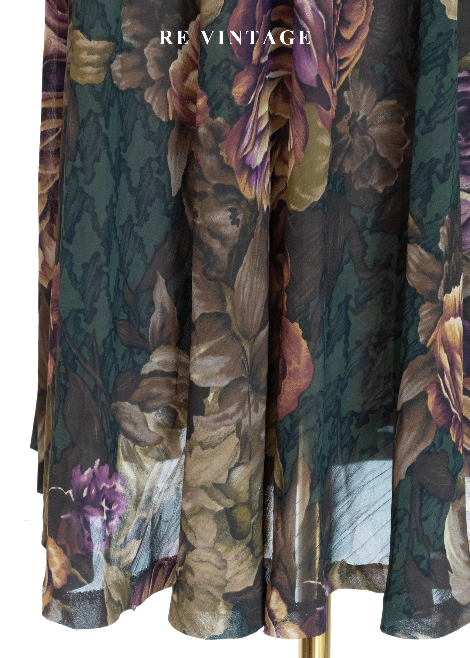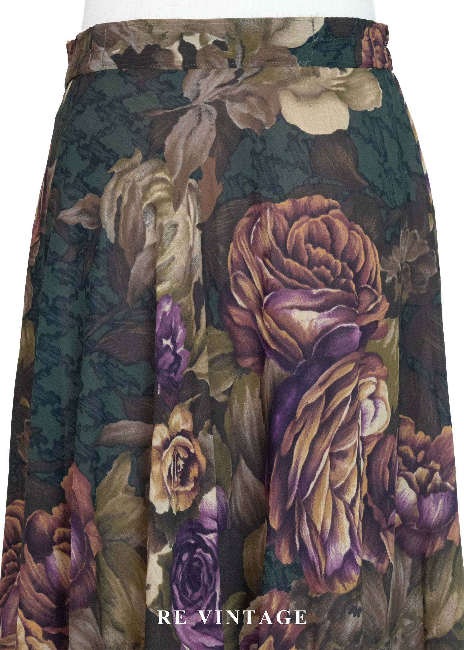 古典大花卉深苔綠千鳥格中長裙(~26")