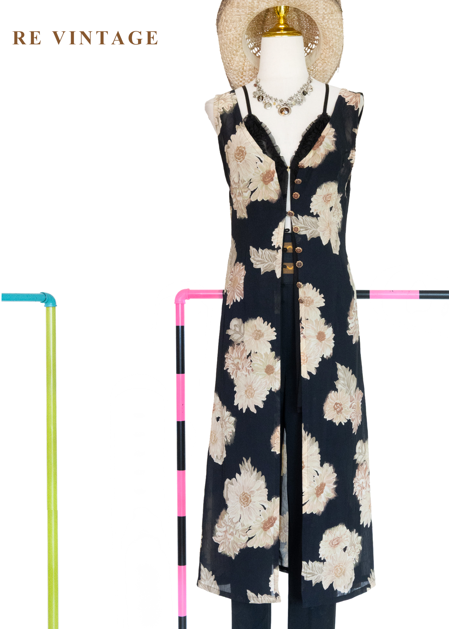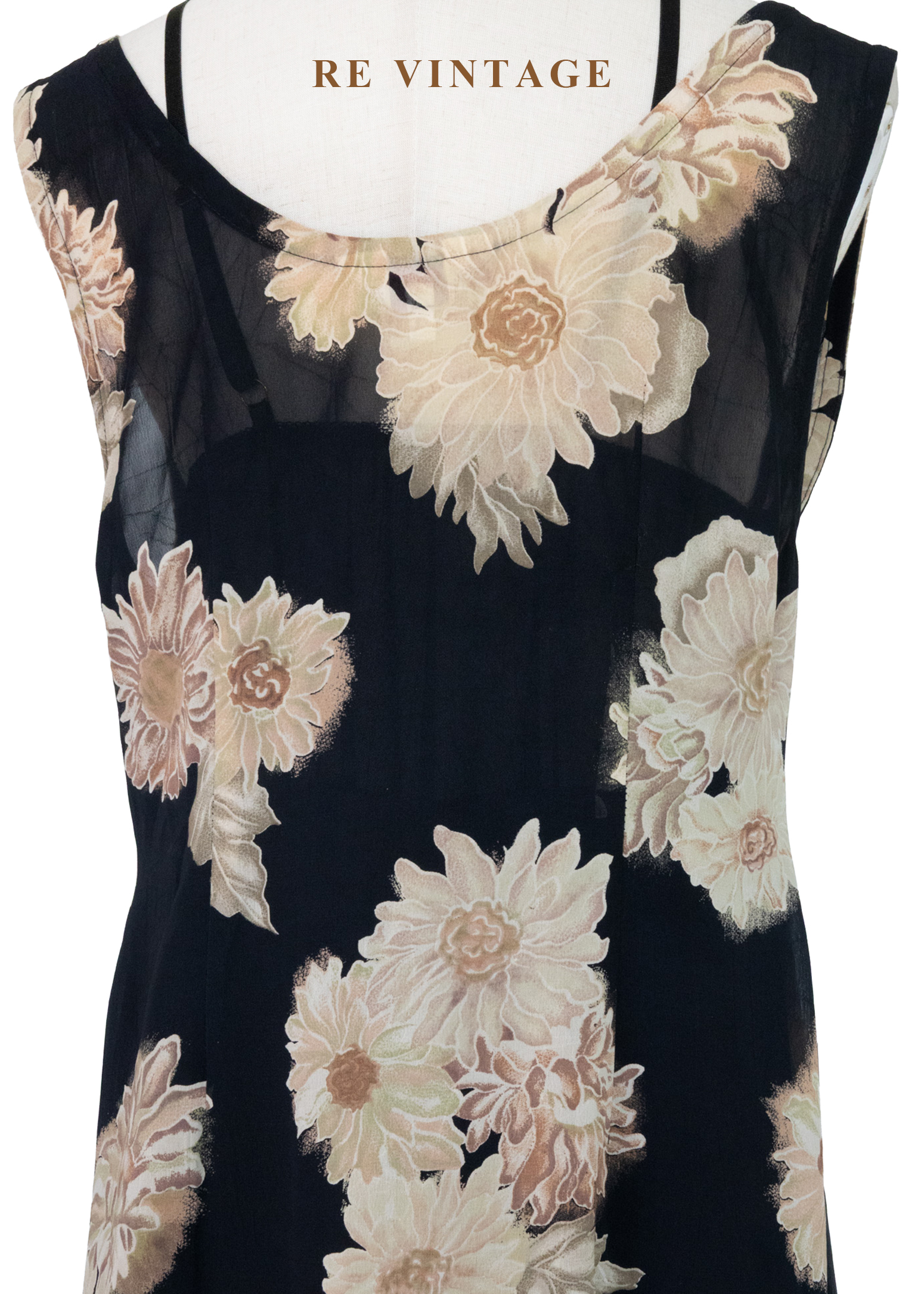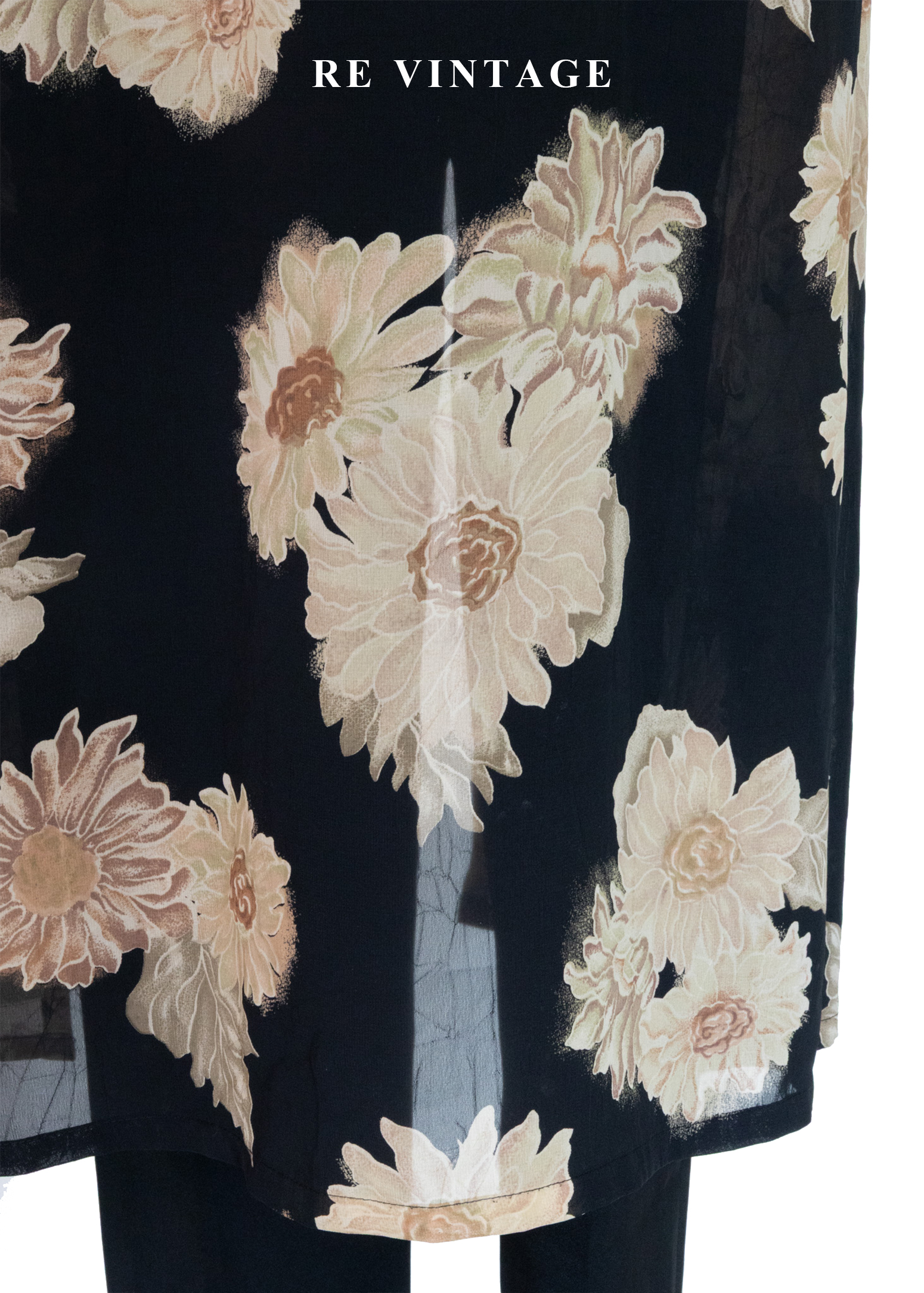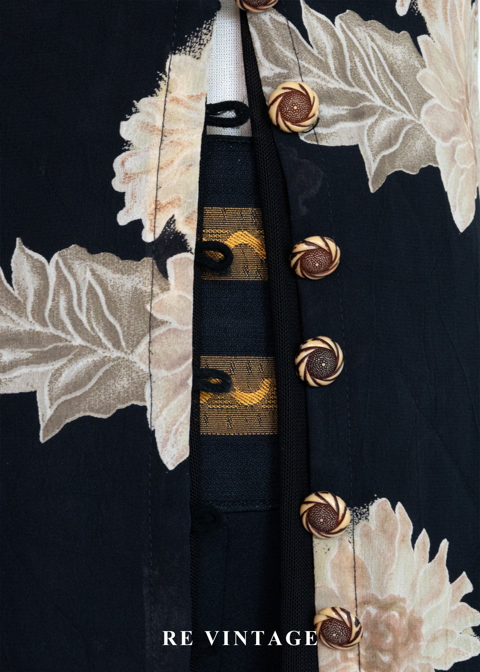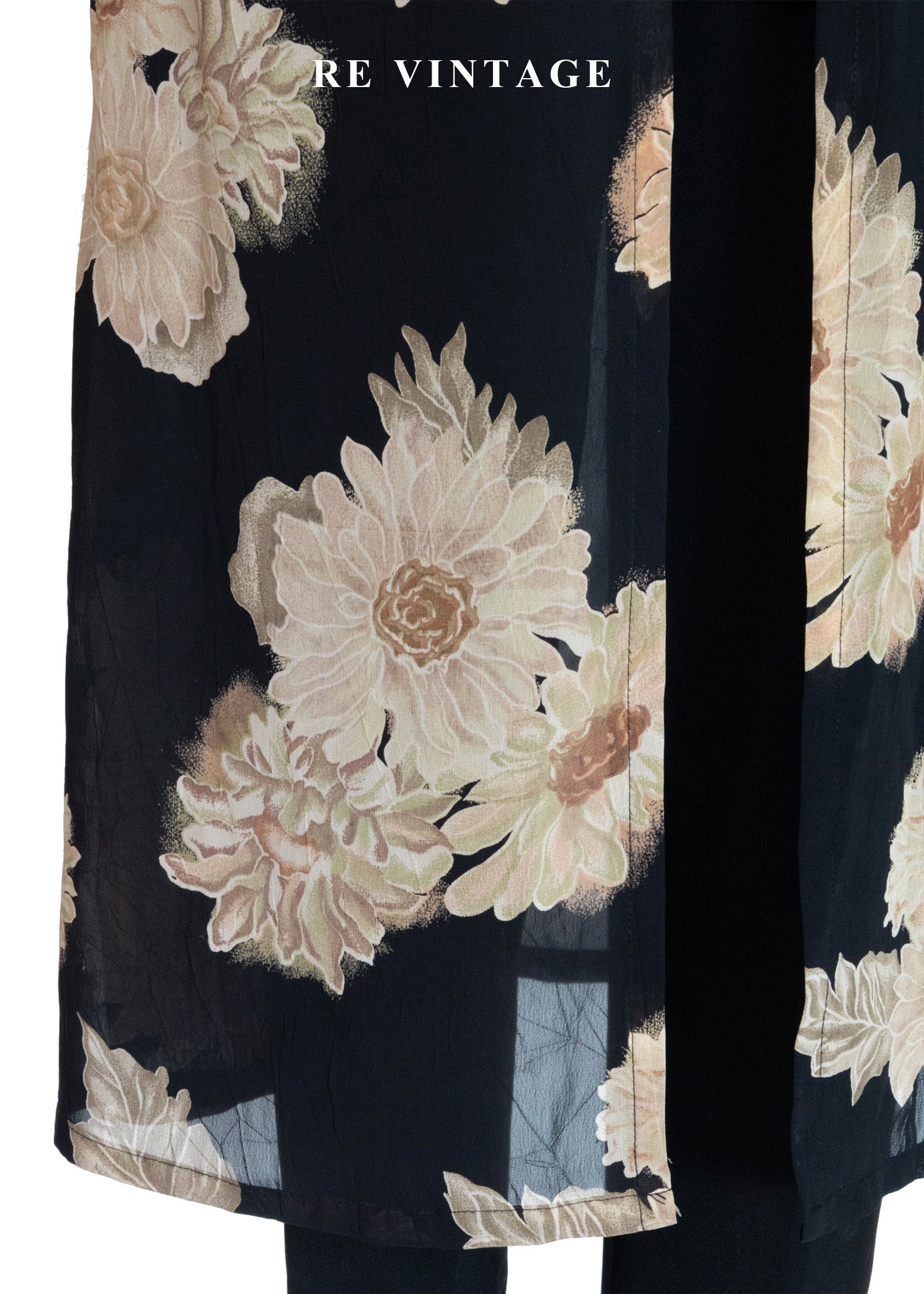 古典黑底米色菊花開襟長版罩衫/長洋裝