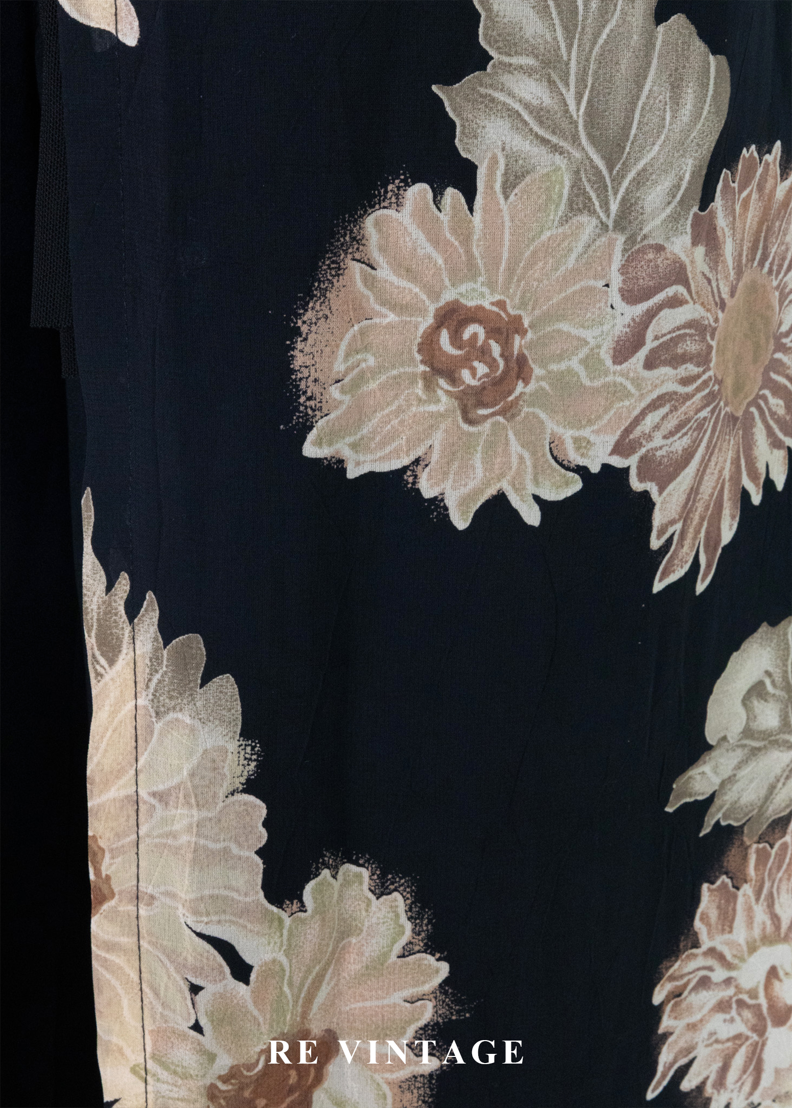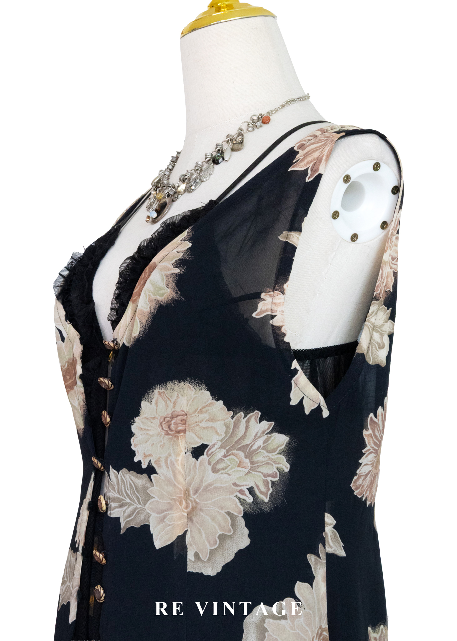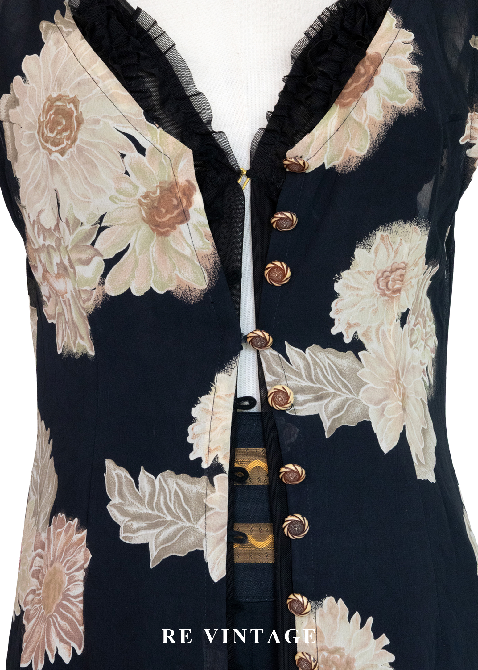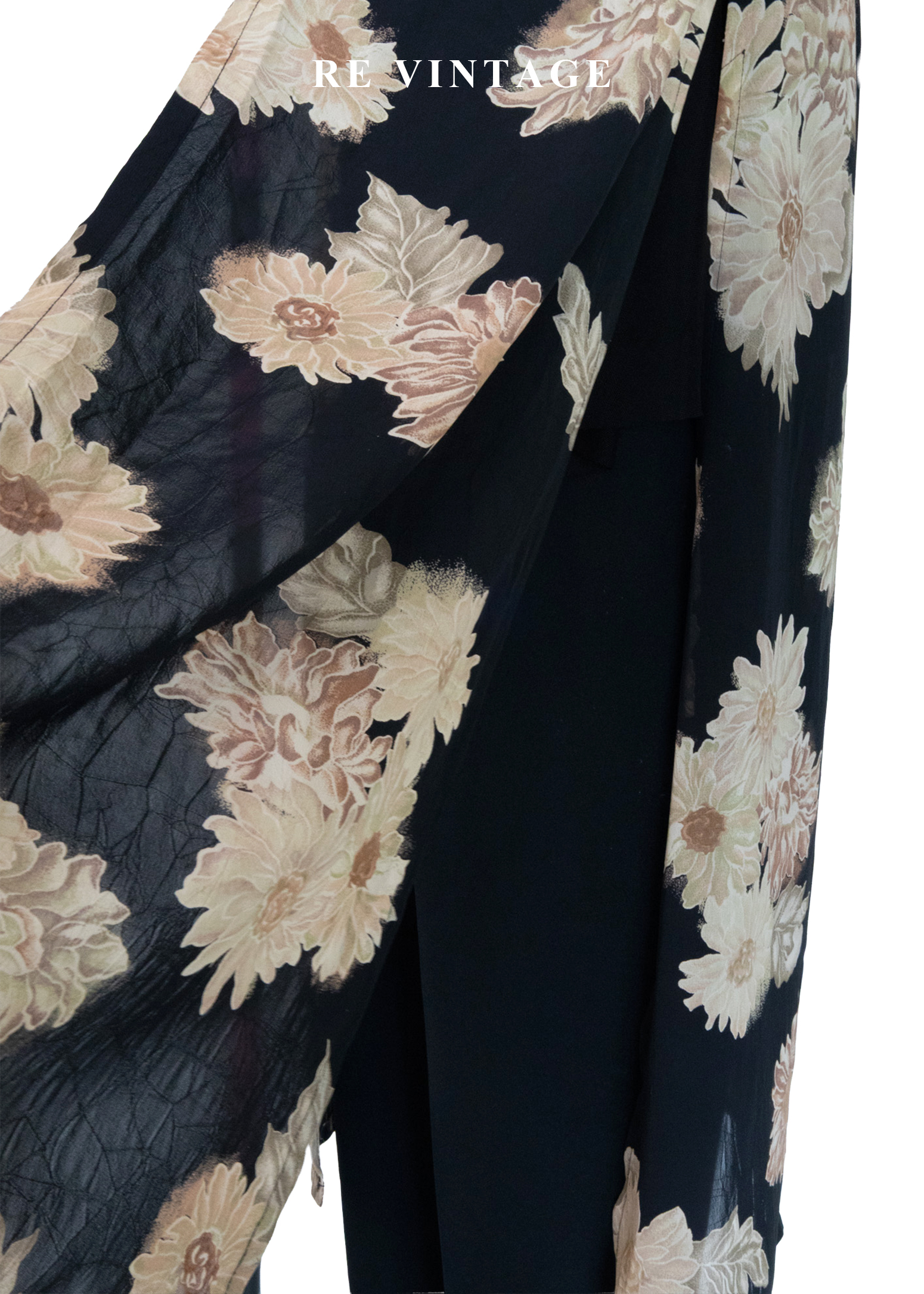 古典黑底米色菊花開襟長版罩衫/長洋裝