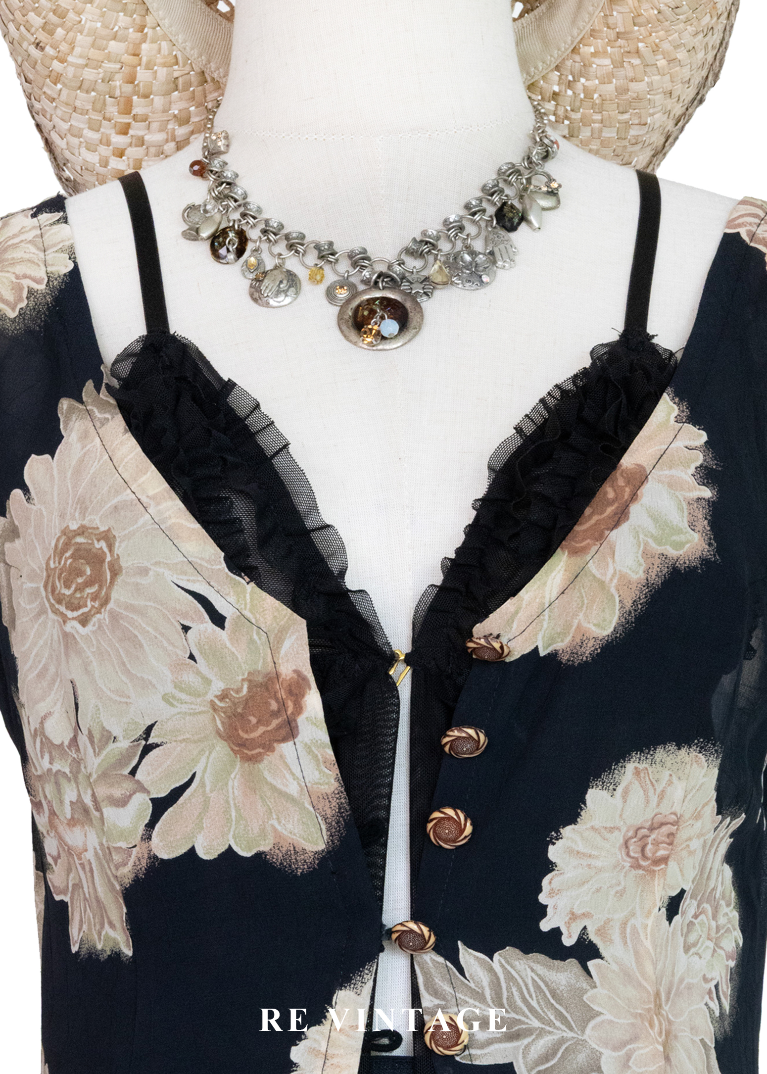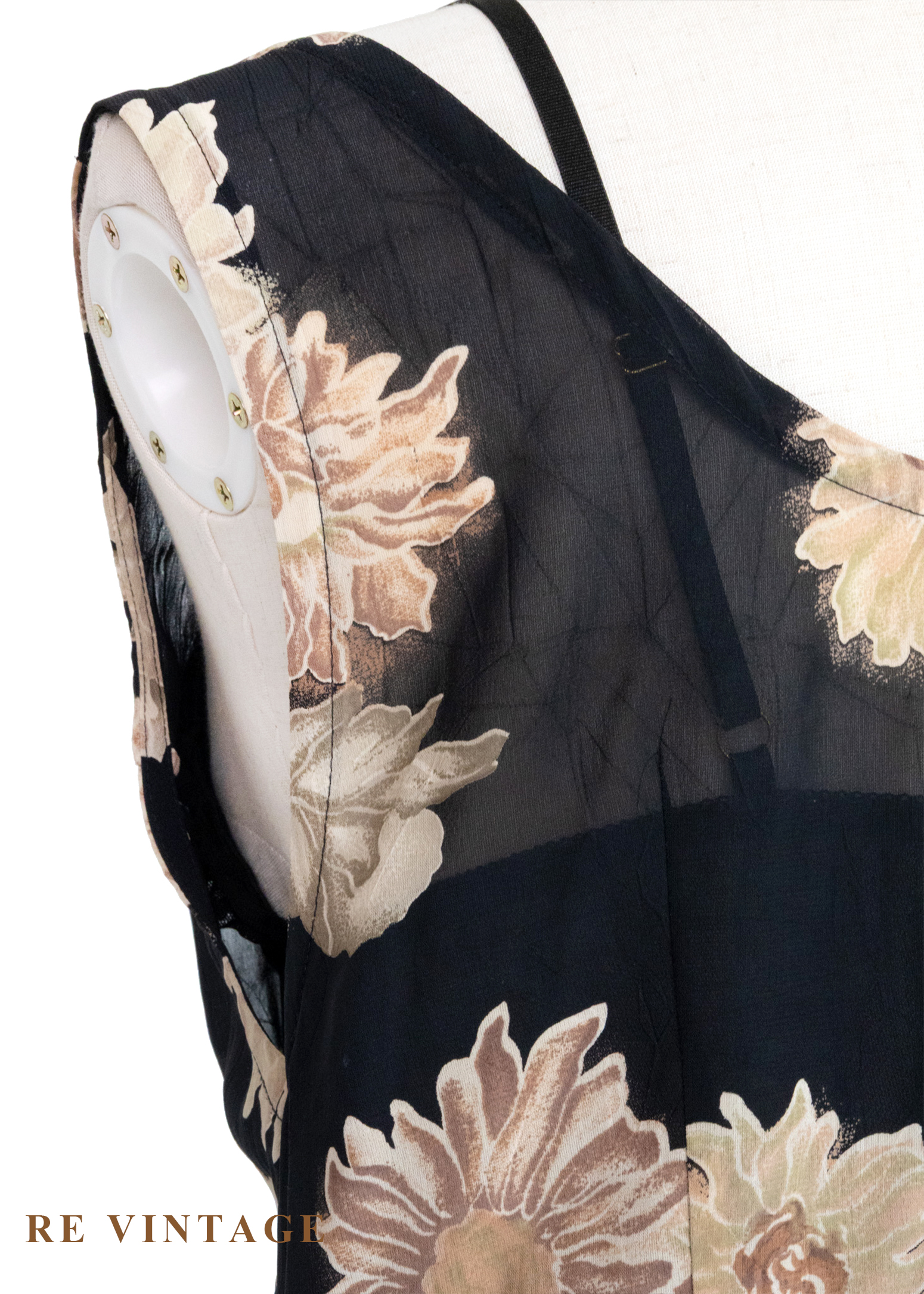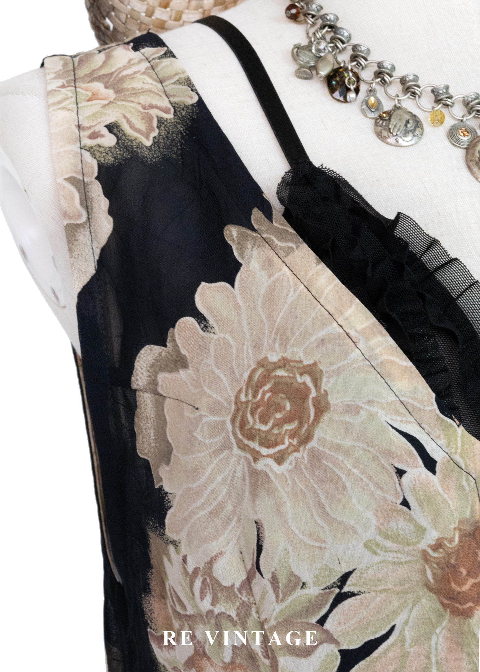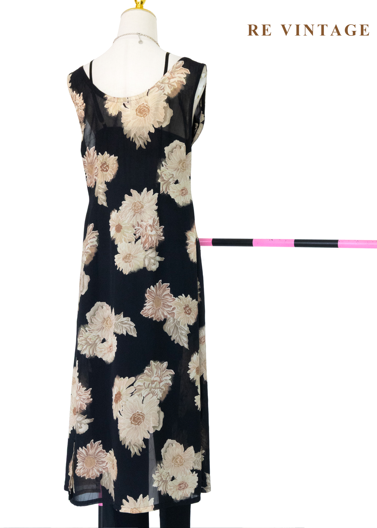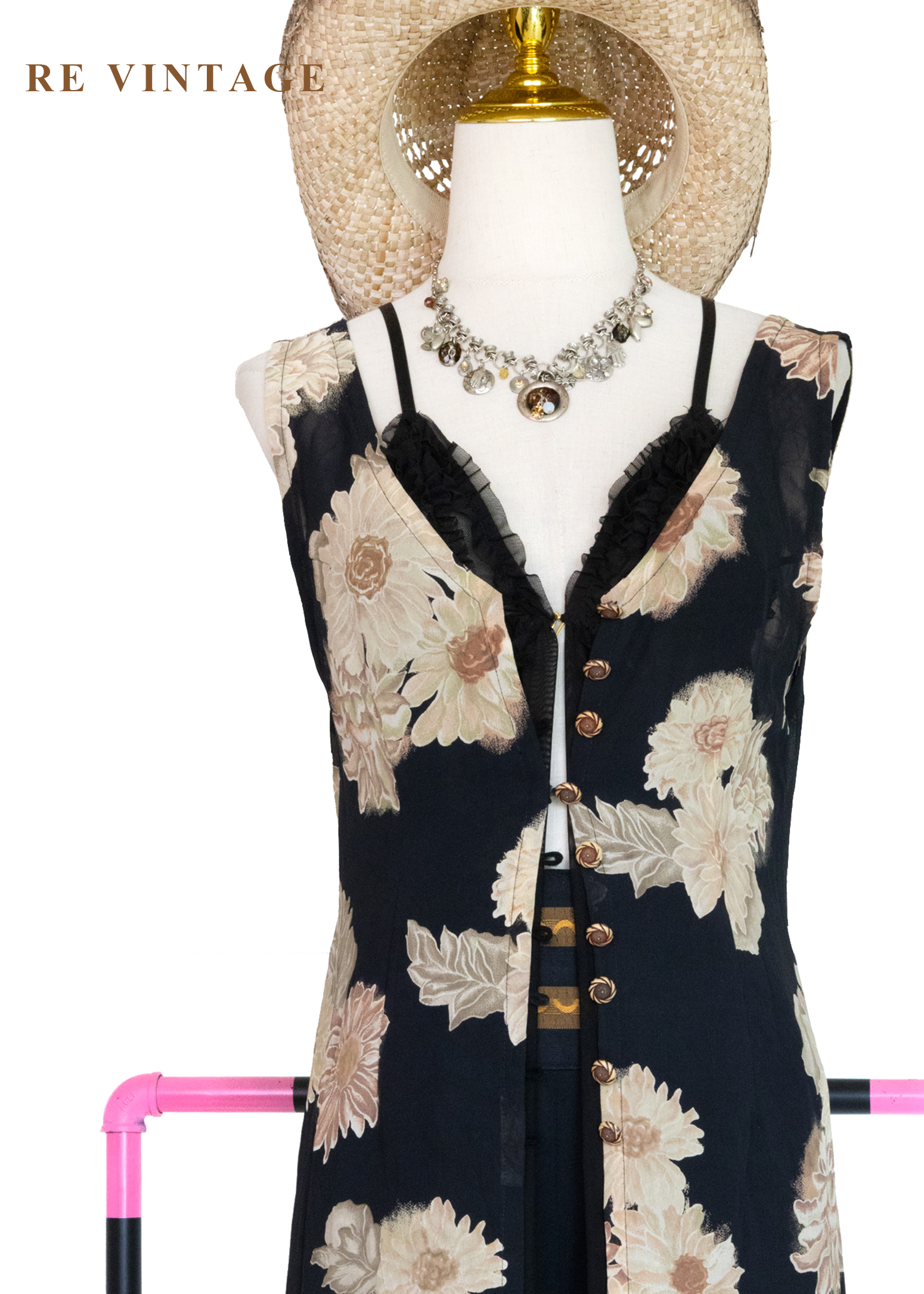 古典黑底米色菊花開襟長版罩衫/長洋裝