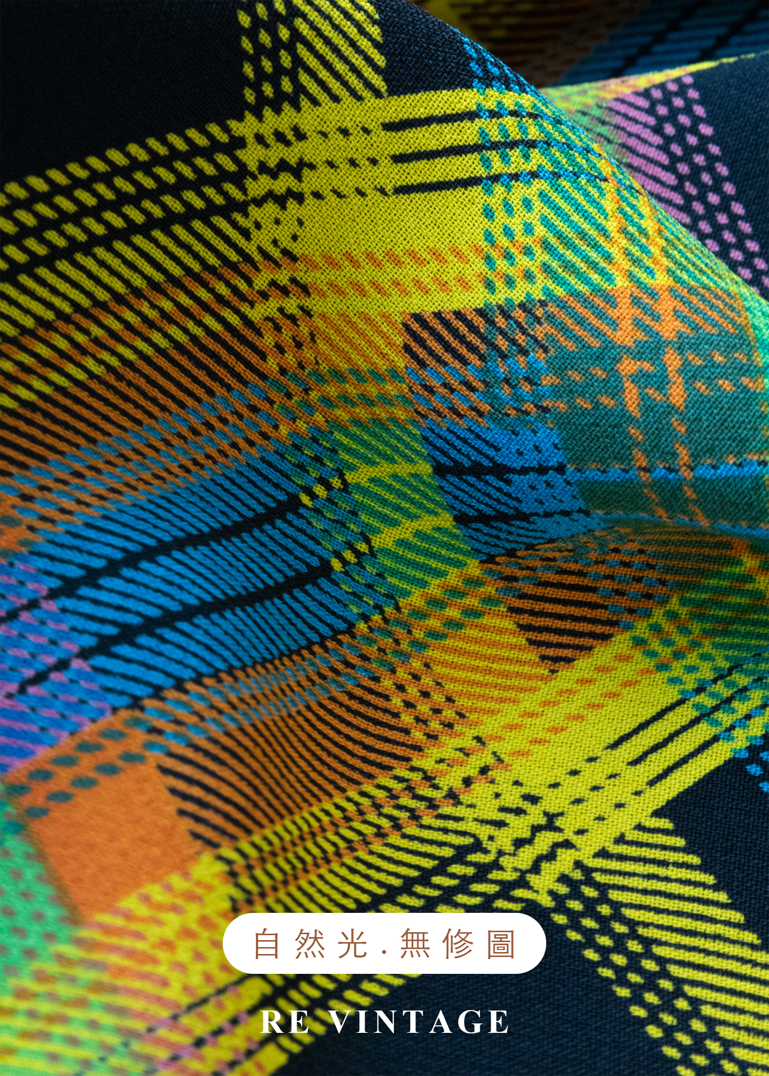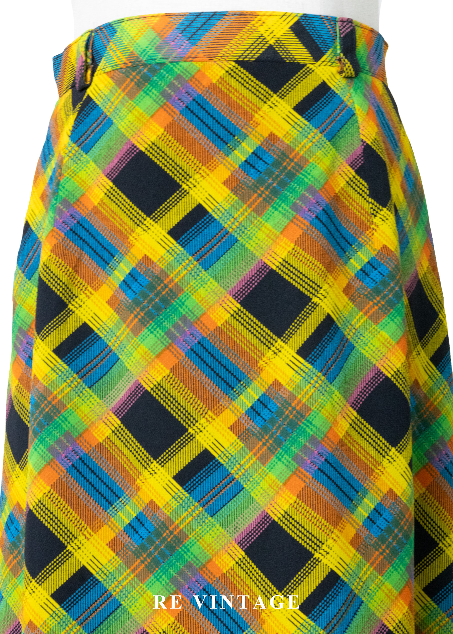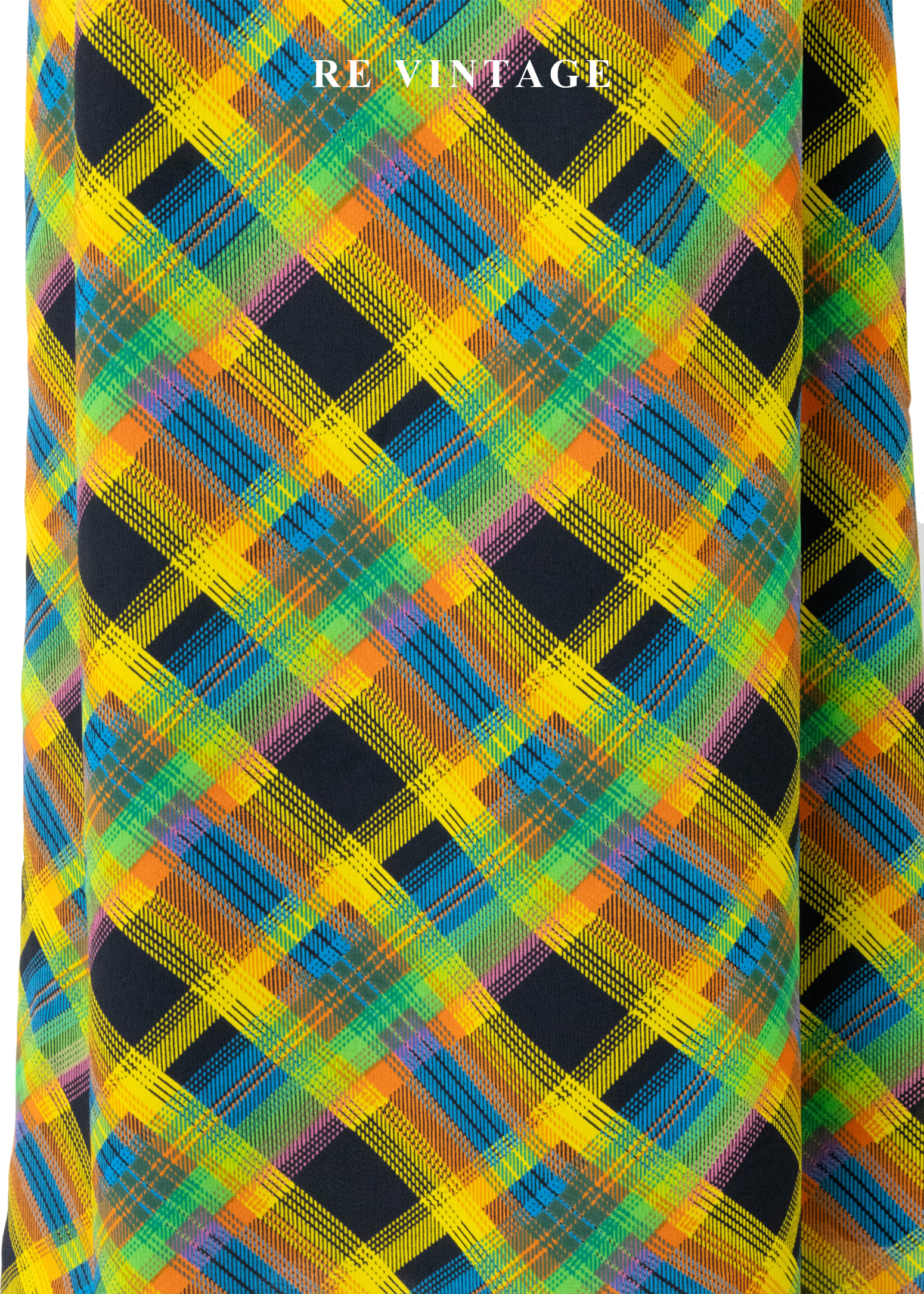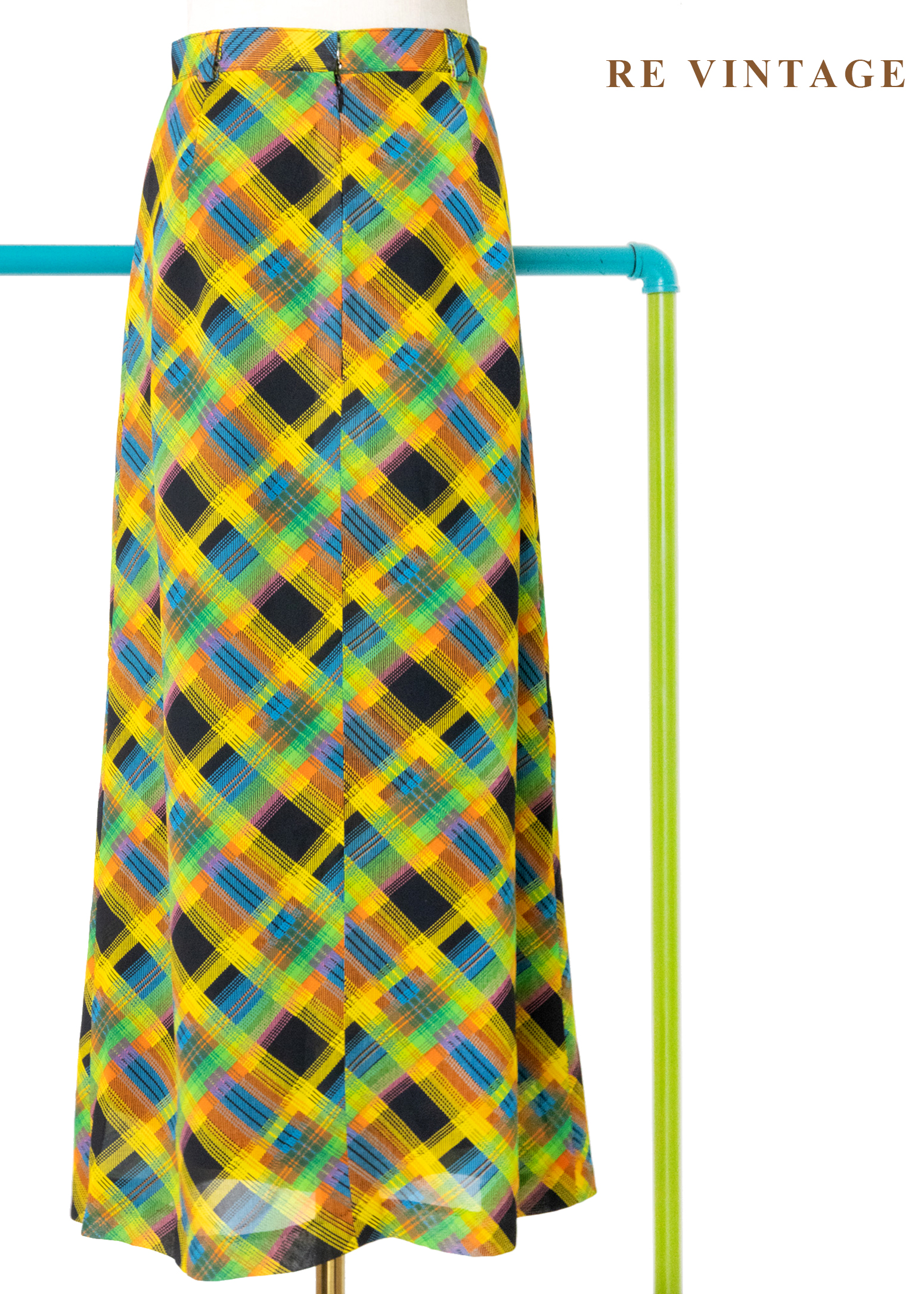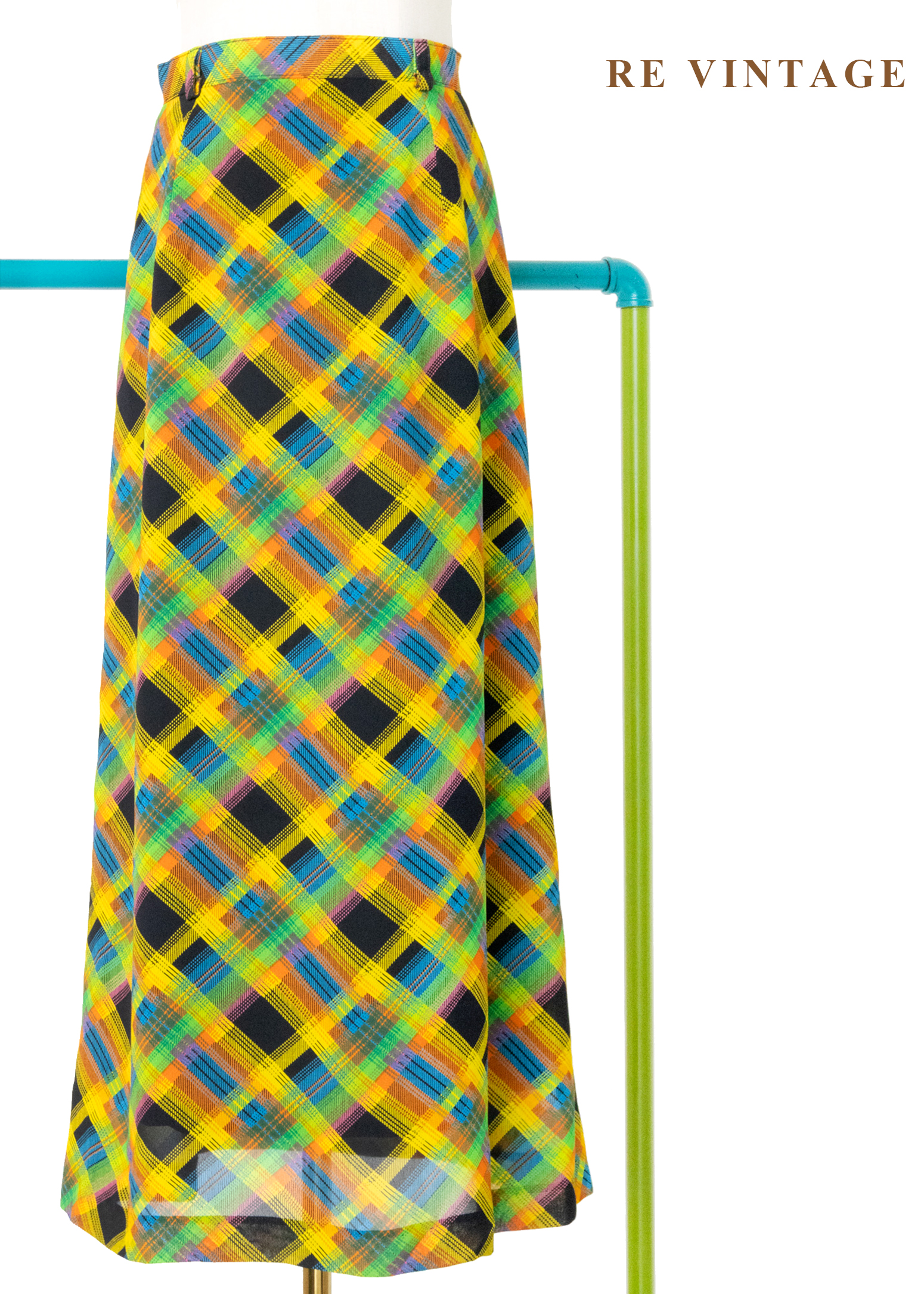 明亮黃綠黑三色交錯斜紋格紋高腰長裙(26")