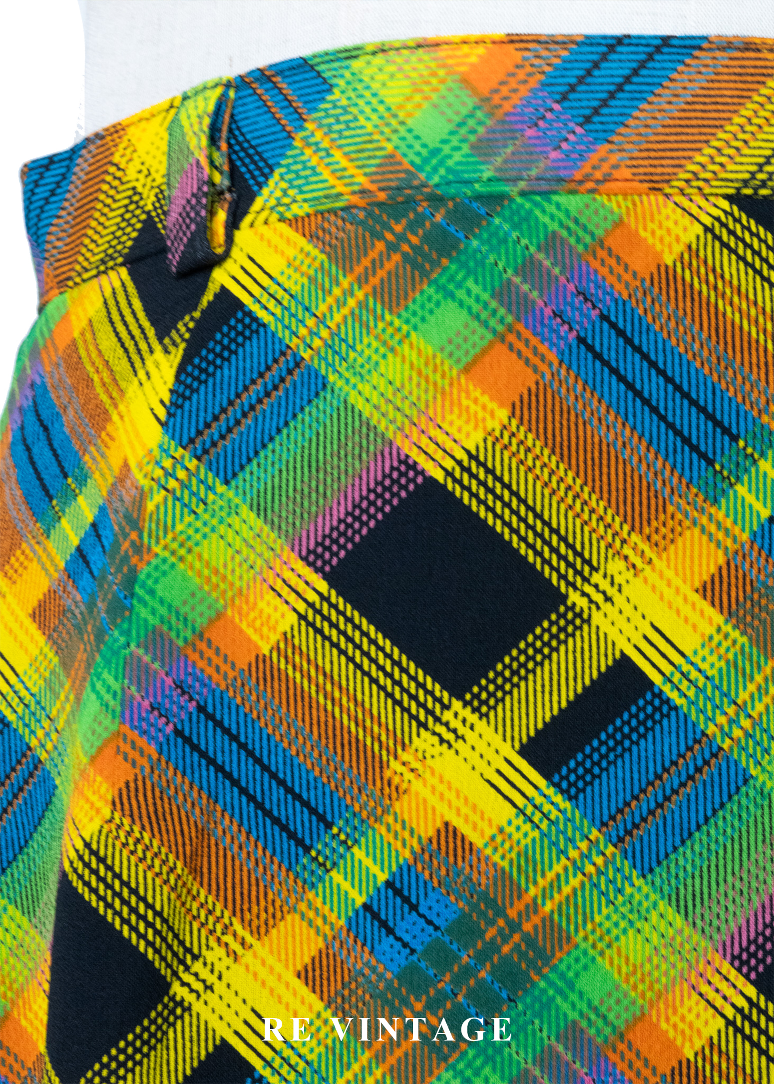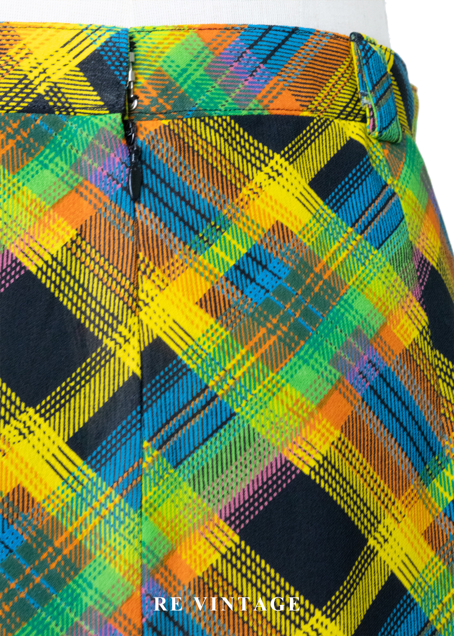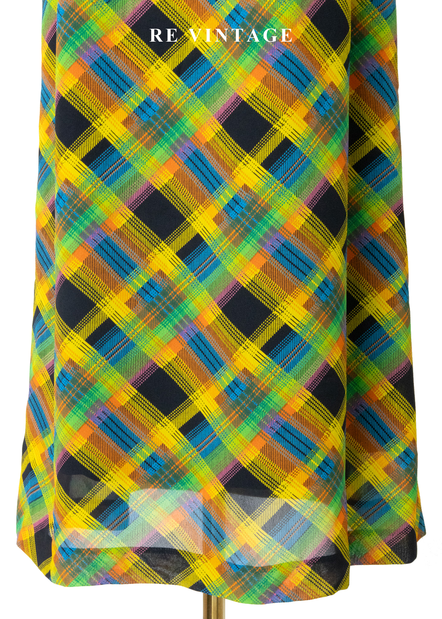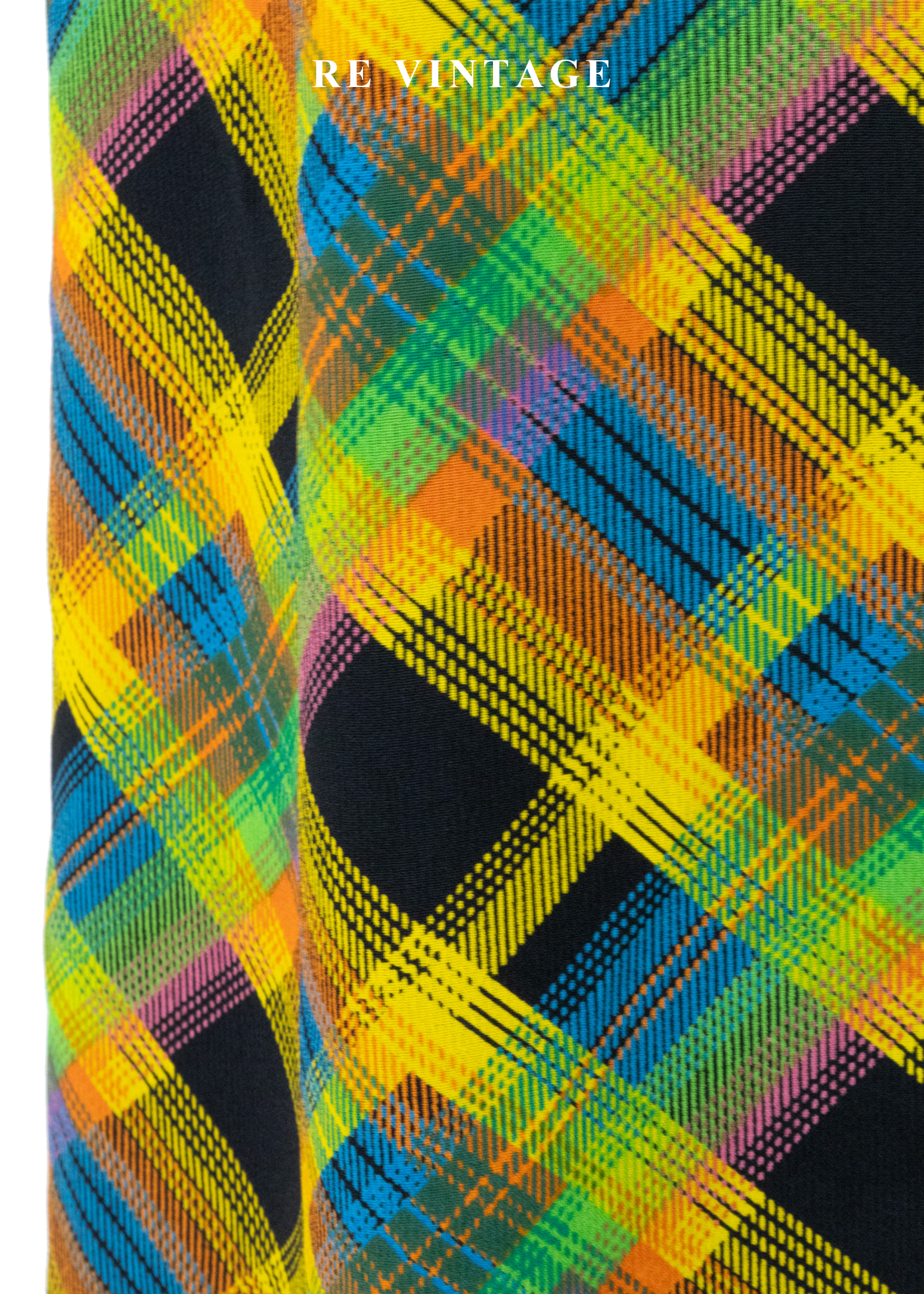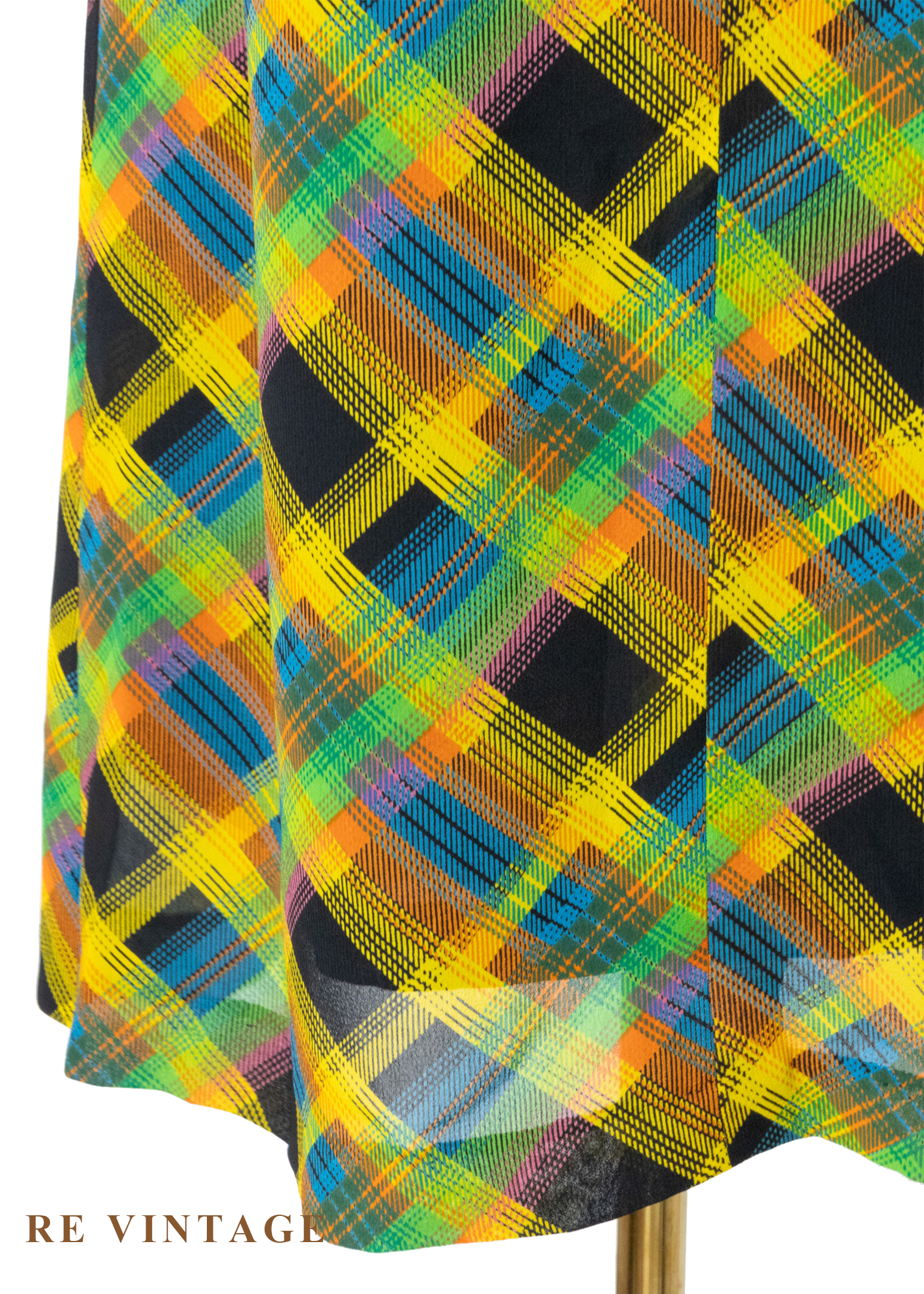 明亮黃綠黑三色交錯斜紋格紋高腰長裙(26")